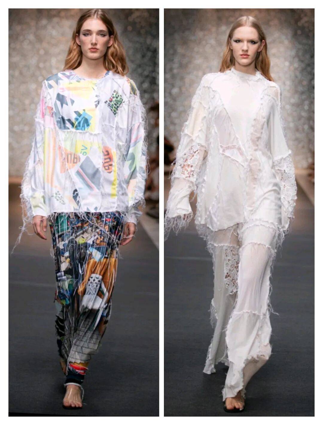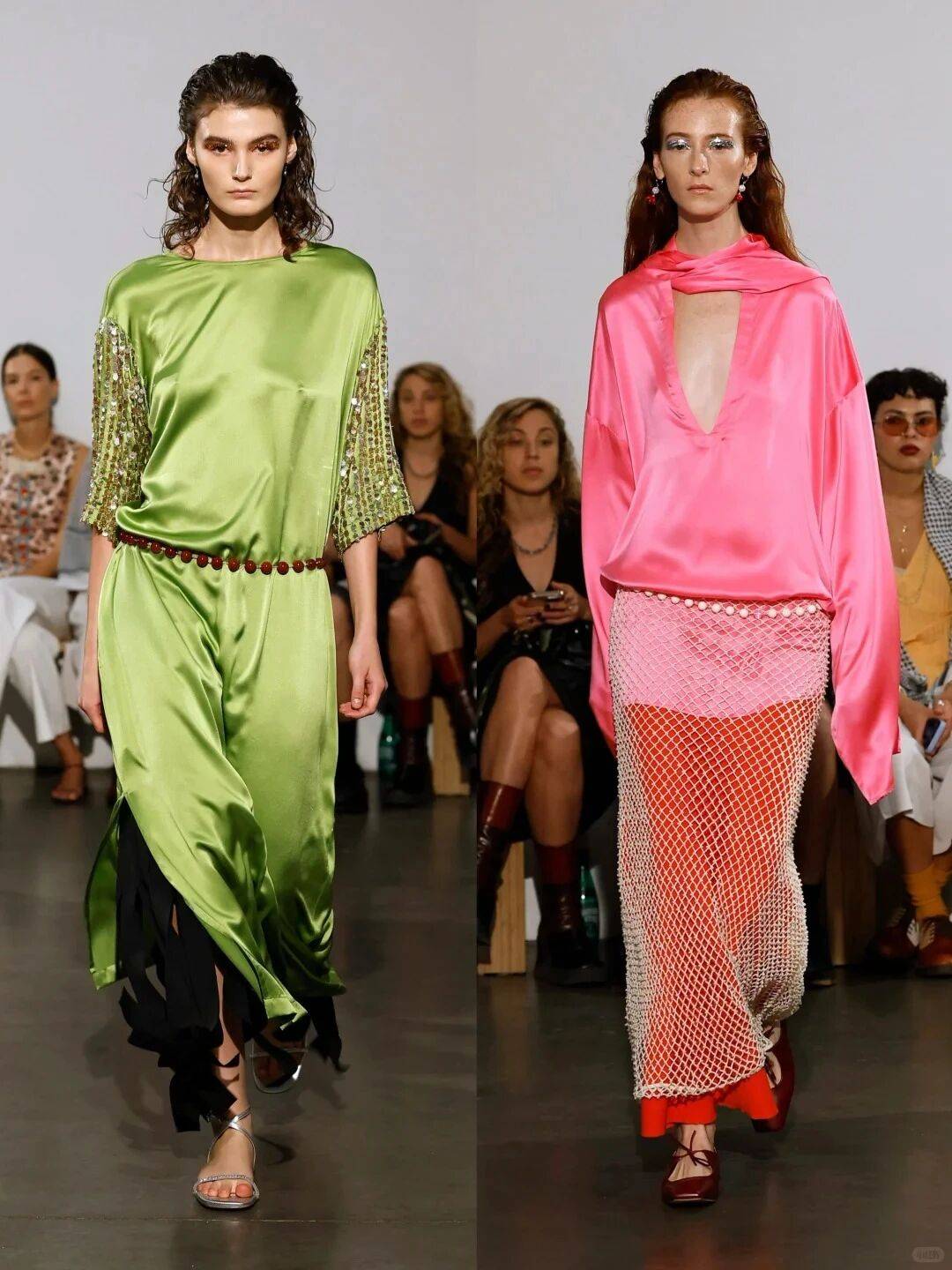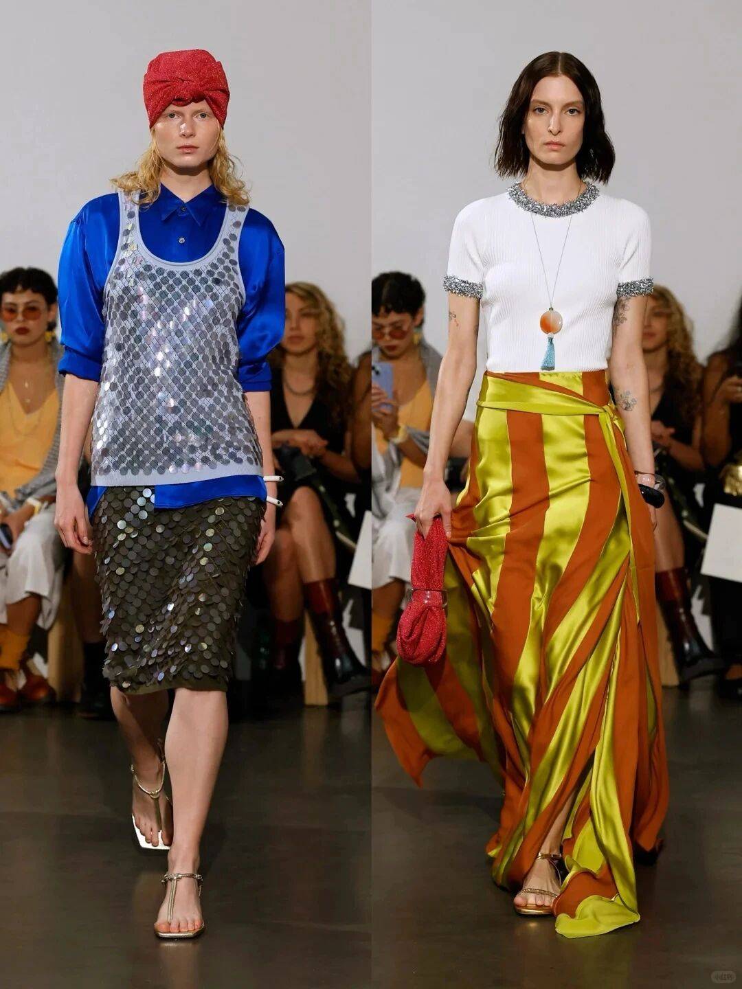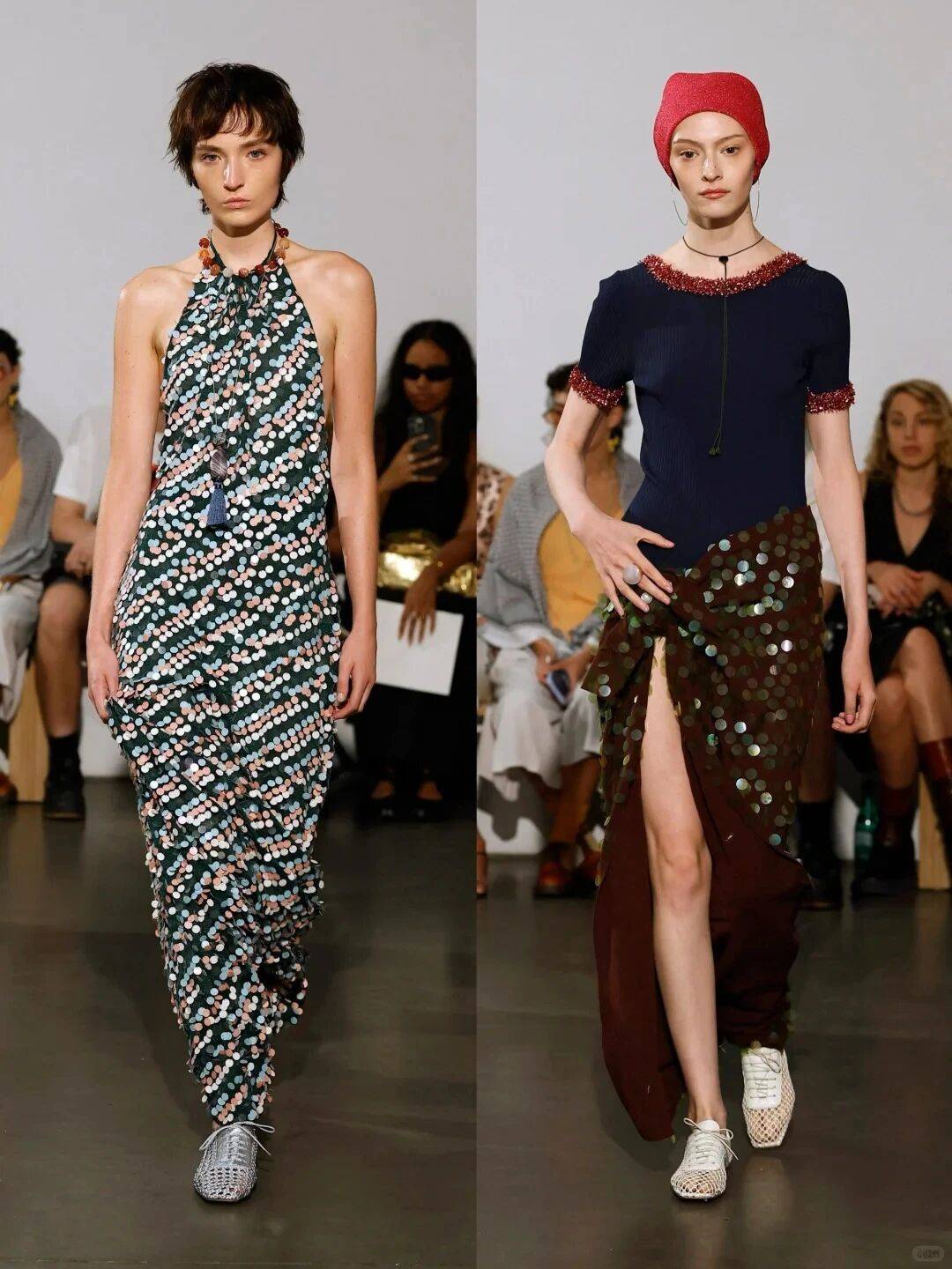 大量采用真丝、缎面等富有垂坠感和光泽感的面料,搭配亮片、网纱等元素,打造出奢华又不失随性的质感。例如亮片装饰的上衣、网纱拼接的半裙,既有复古disco风的张扬,又融入现代时装的前卫感,完美平衡了华丽与日常。