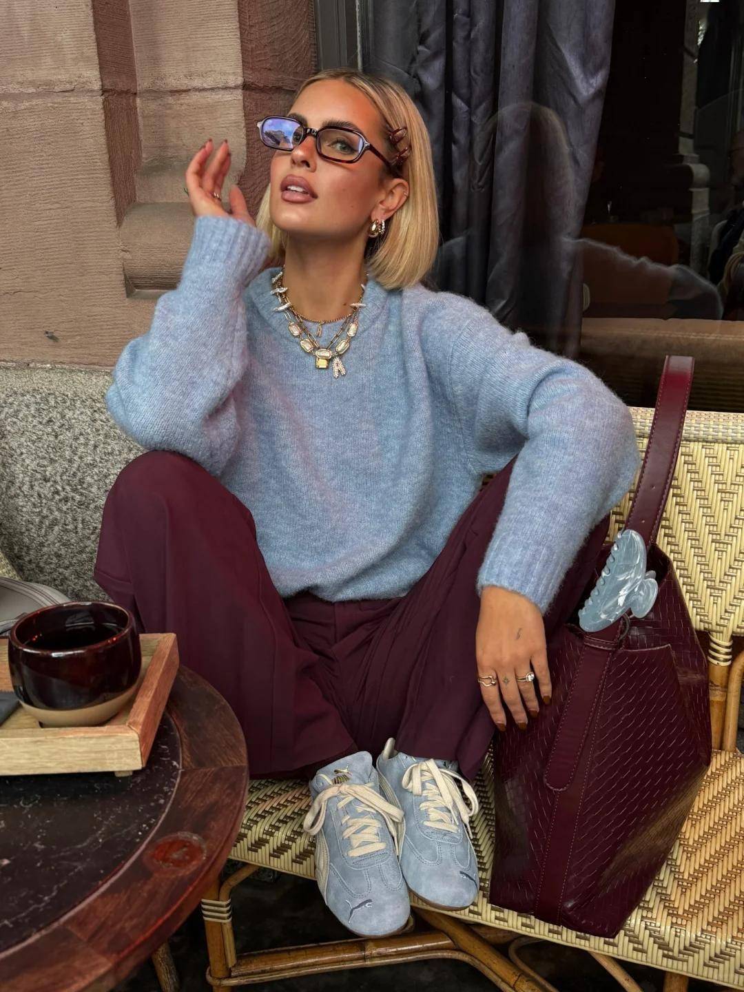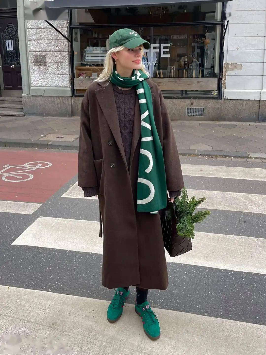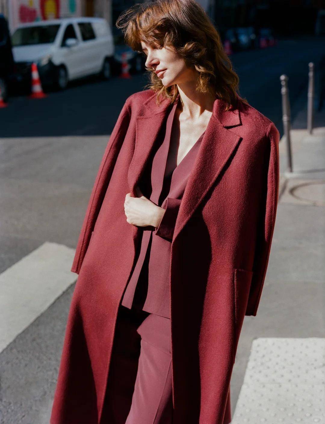 比如驼色大衣内搭灰调针织衫,再以酒红色围巾点睛,既保持整体和谐又不失亮点。
