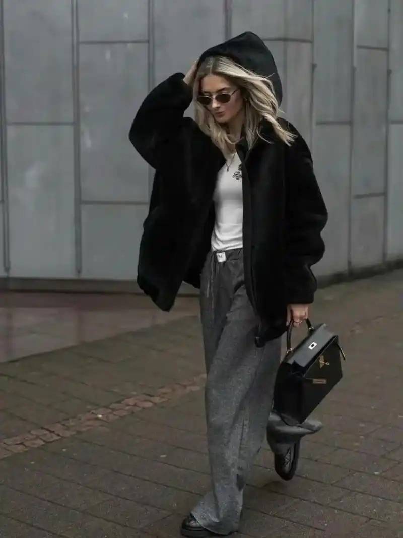而皮夹克与直筒牛仔裤的硬朗组合,内搭柔软舒适的卫衣,则能创造出刚柔并济的现代摩登感。