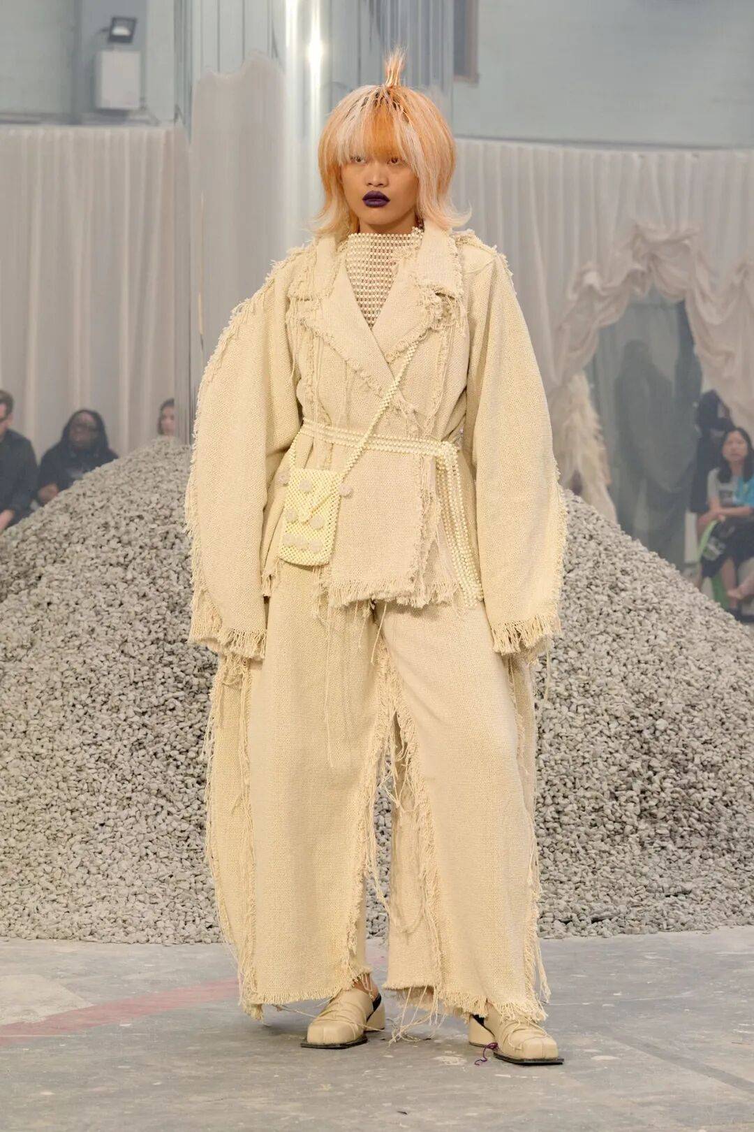 此外,IAMISIGO的2026春夏系列还在色彩选择上与流行趋势形成了有趣的对比。设计师通过使用乌干达有机棉、肯尼亚剑麻、尼日利亚拉菲草与黄麻等材料,创造出了一系列具有浓郁非洲风情的服装,这些服装在当下时尚语境中熠熠生辉。