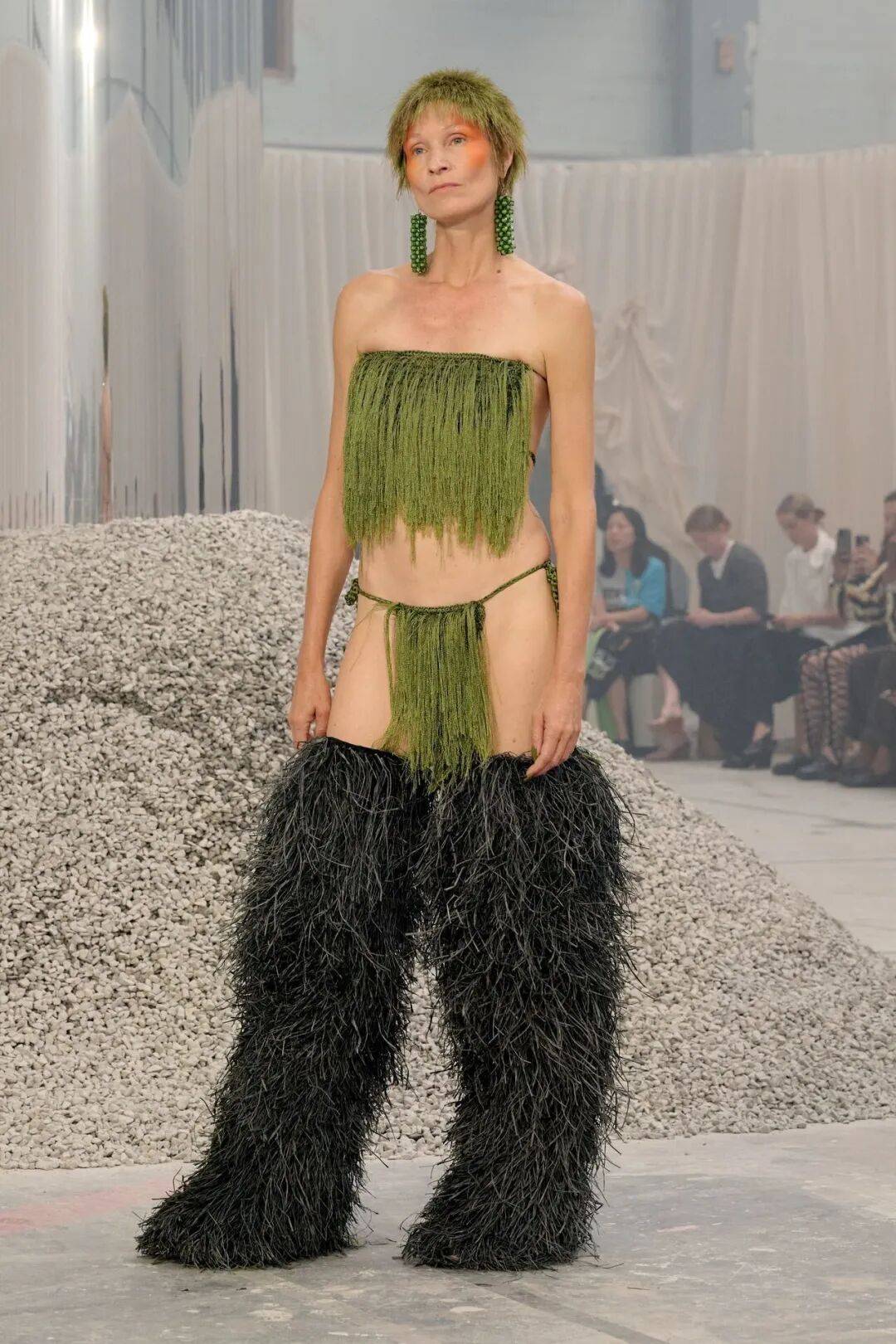 其中,一件由拉菲草编织而成的裙子尤为引人注目。这件裙子不仅仅是一件普通的时装,它代表了非洲大地的馈赠和游牧民族的生存智慧。拉菲草作为一种接地性材质,经过手工编织和打结工艺处理后,形成了宽松的廓形,这种设计不仅增强了服装的实用性,还赋予了穿着者一种与自然相连的感觉。