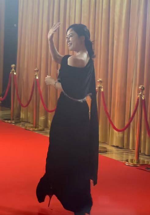 她脚上踩着的高跟鞋也是黑色的款式,跟她的礼服颜色遥相呼应,走起路来稳稳当当的,每一步都显得自信满满。