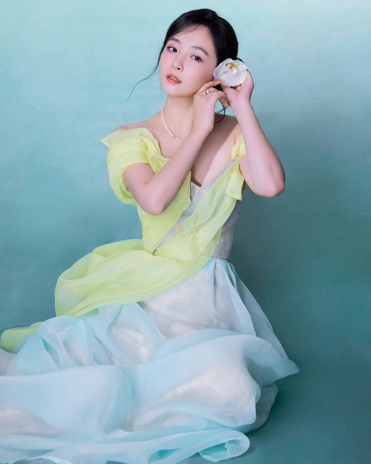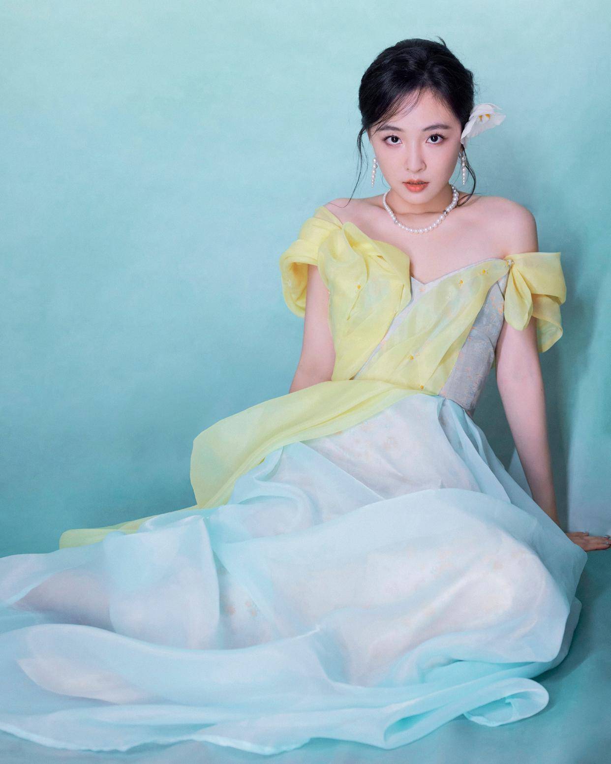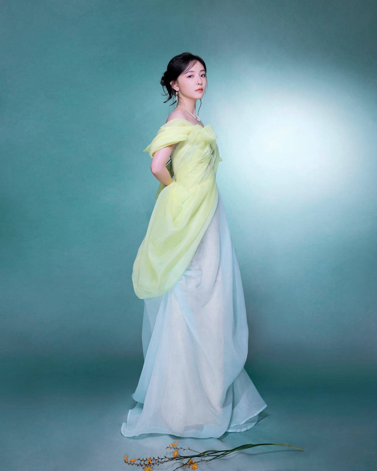 礼服的配色本身就很有巧思:上身是嫩黄色的薄纱,像把春日的阳光揉在了布料里,而裙摆渐变到淡青色,又带着点雨后草地的清爽,两种颜色过渡得自然又柔和。设计上更是精准踩中了 “显身材又不刻意” 的 点:V 领的弧度刚好露出精致的锁骨,收腰处的缝线把腰线往上提了一公分,既拉长了比例,又让腰臀的曲线更柔和;肩头的薄纱袖是 oversize 的蓬松款,却不会压个子,反而衬得手臂线条更纤细,走动时纱料轻晃,连带着身姿都跟着灵动起来。