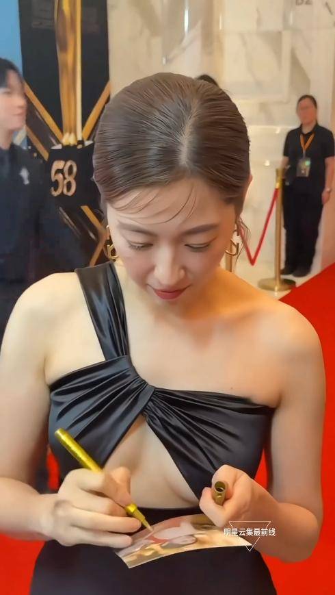 走红毯时她那气场,简直能掀翻屋顶!抬头挺胸,步伐从容,每一步都踩在节奏上,像在走T台秀。摄影师们的快门声就没停过,闪光灯亮得跟放烟花似的。到了签名墙前,她微微侧身签名,裙摆自然散开,那画面美得像幅画——连旁边的工作人员都看直了眼!