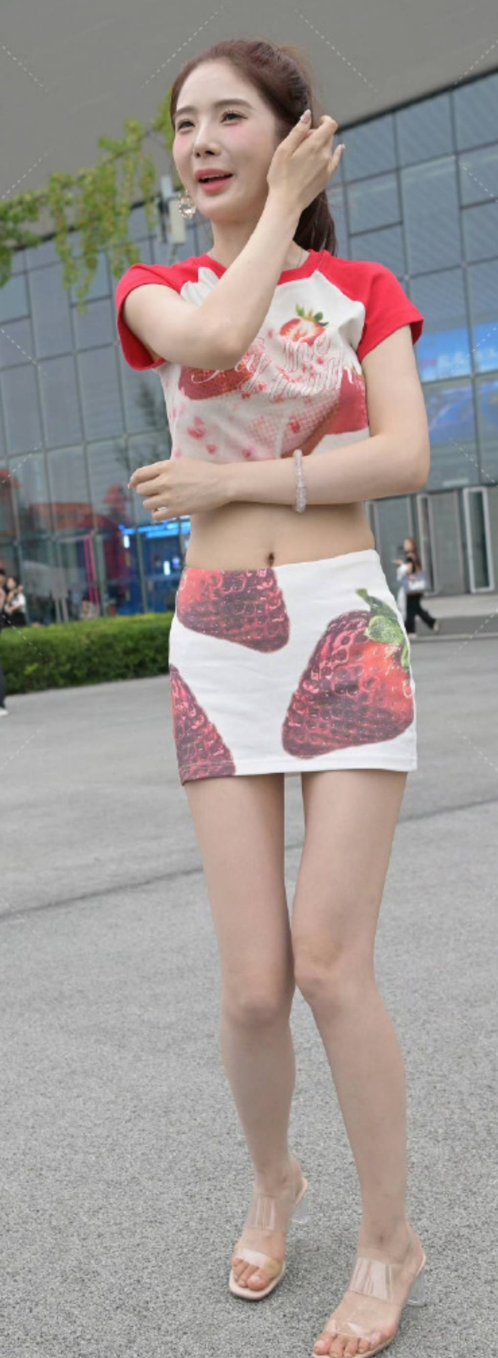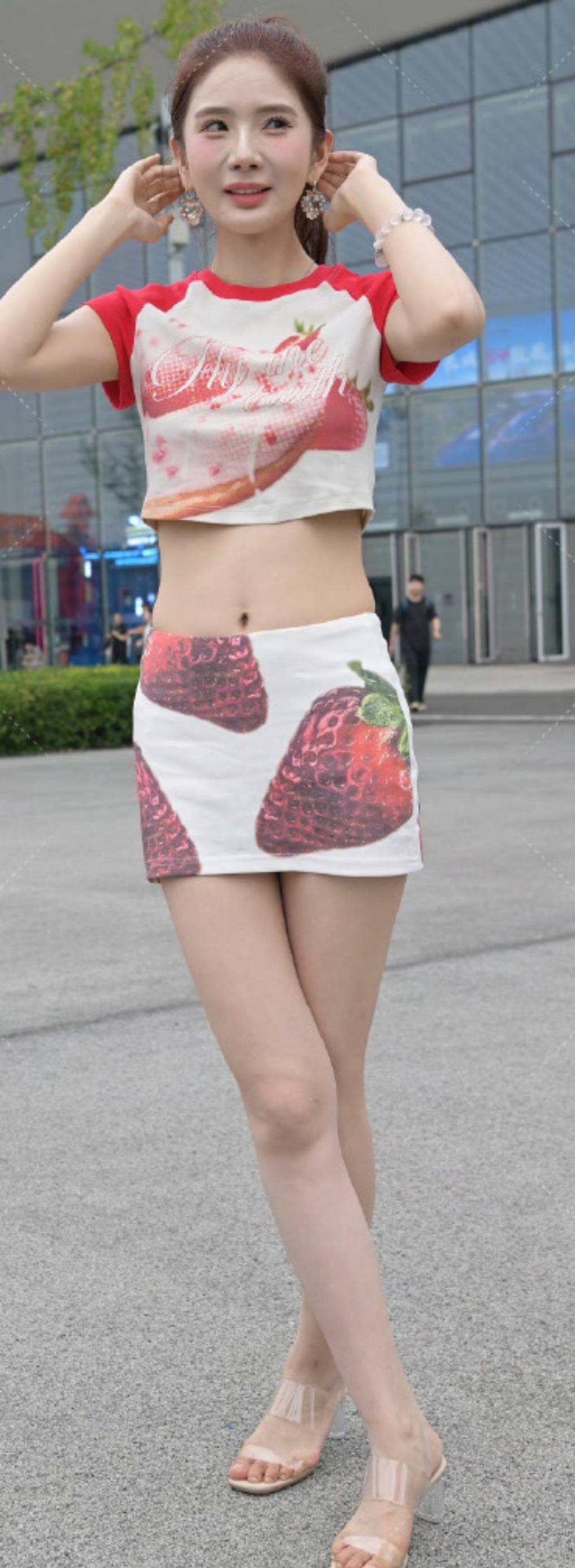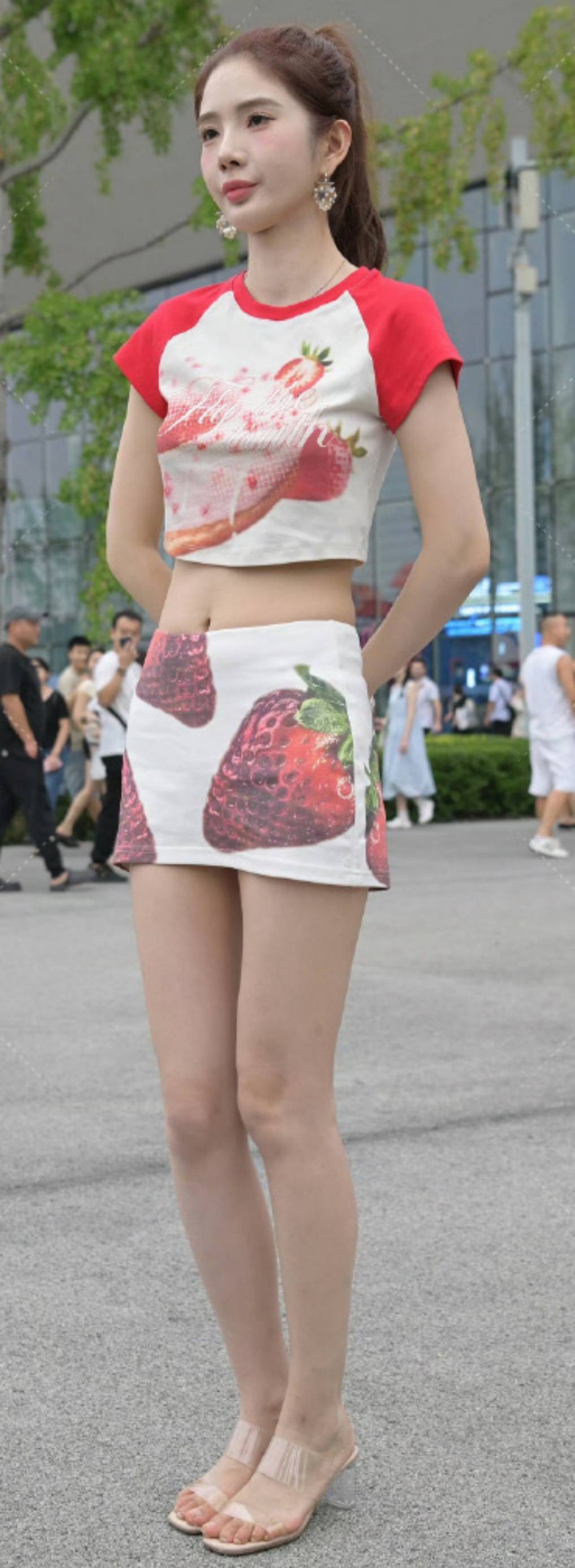 肤白貌美的美女好亮眼,草莓印花短款套装衬得身形舒展,清甜又俏皮,红白拼接的配色裹着鲜活的草莓图案,往身上一穿就带着甜甜的元气感,既顺着身形衬出了轻盈的线条,又不会显得刻意花哨。