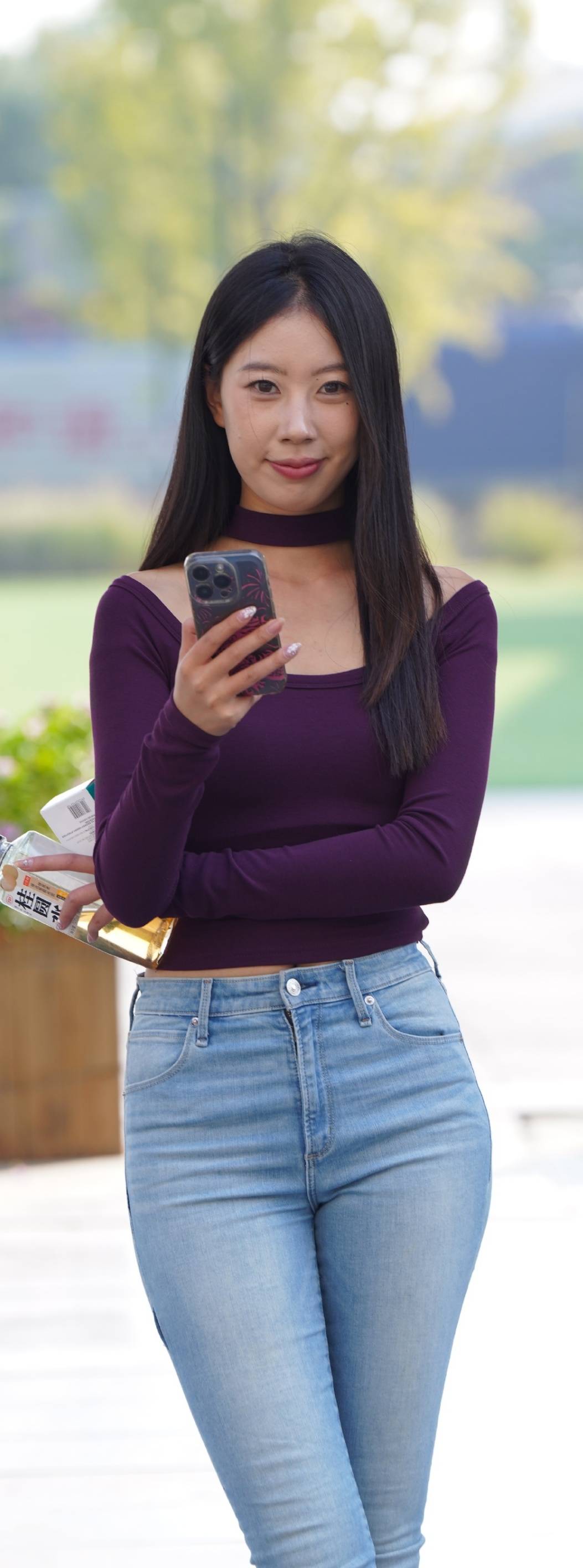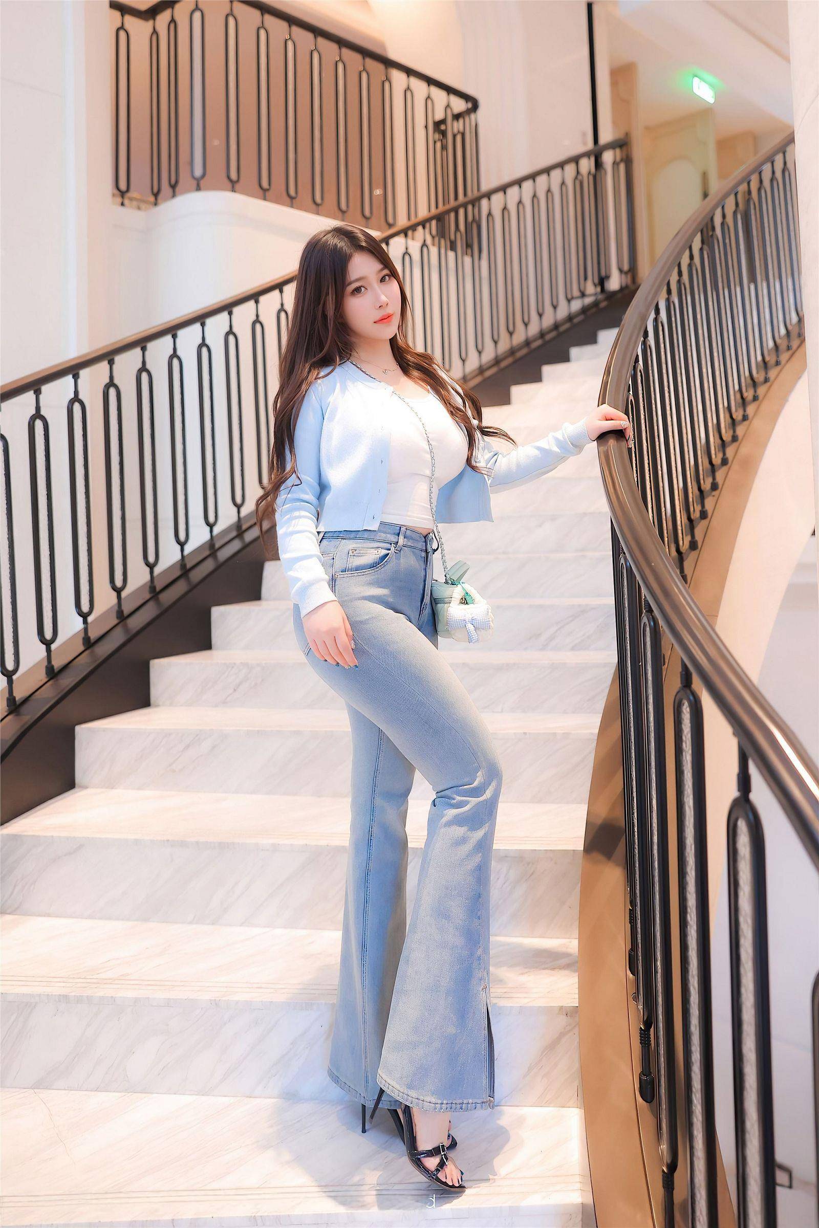 蓝色牛仔裤是修身版型,往上收在腰最细的地方,顺着臀腿线条紧密贴合,勾勒出匀净曲线,侧边开衩细节添了点轻浅灵动,不会显得沉闷。裤装长度顺着腿部往下延伸,把腿的线条衬得修长流畅,和上衣的紫色搭在一起,色调反差里透着和谐利落,把比例衬得愈发舒展。