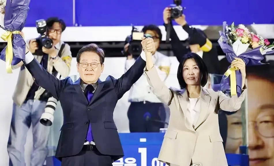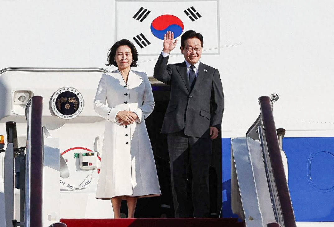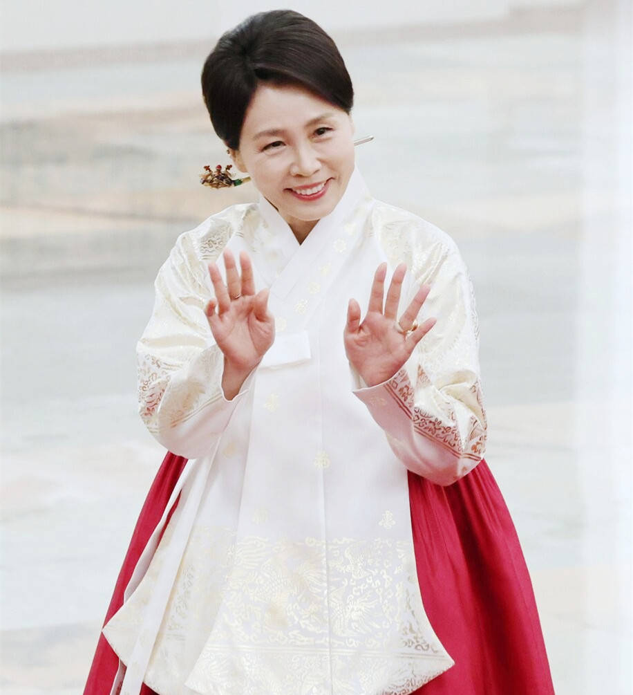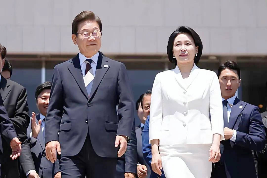 色彩象征意义强:她选择的皇家蓝大衣沉稳大气,象征信任与稳定;而丈夫李在明佩戴红色领带,形成“红蓝搭配”,既是对中国的尊重,也展现内外协调的外交语言。