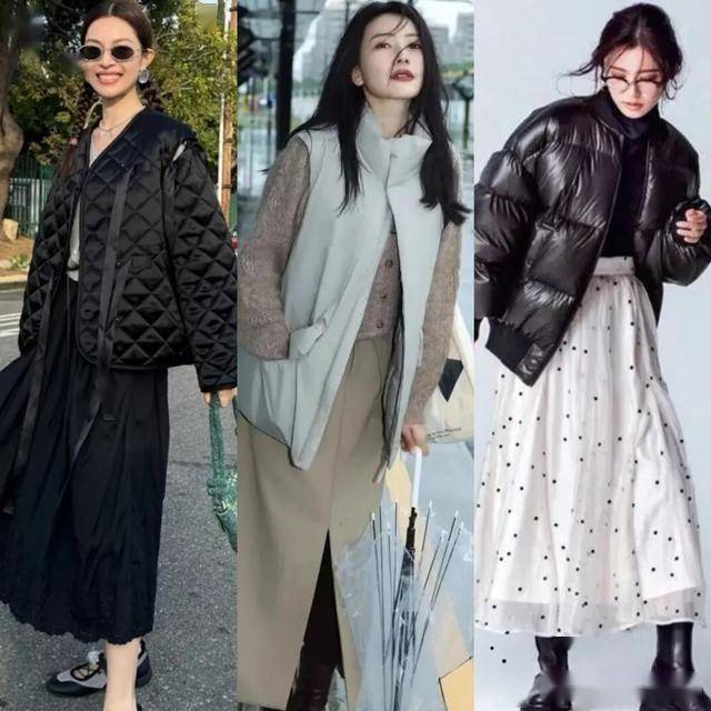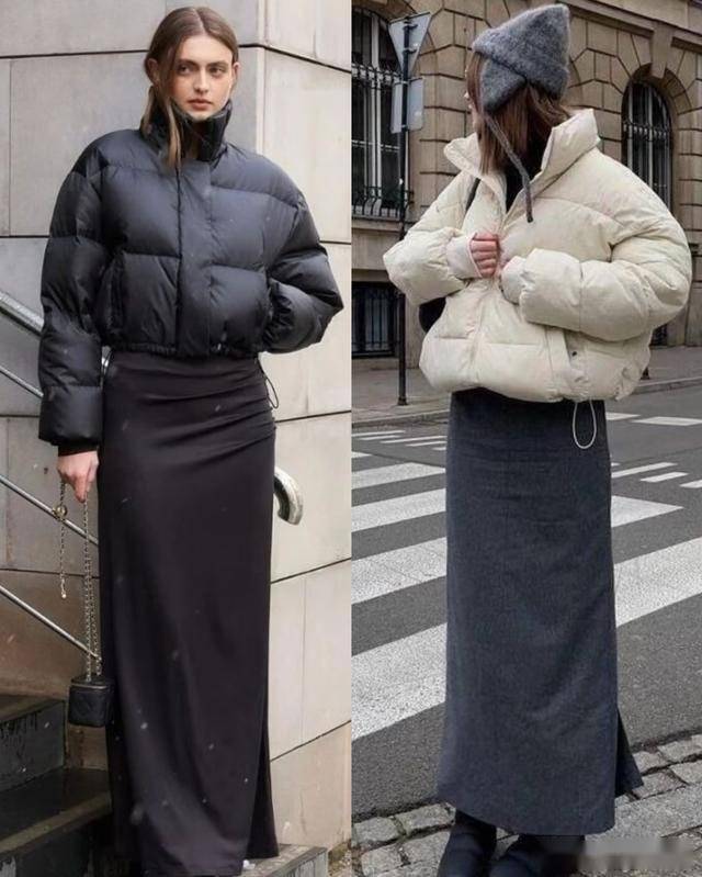 短羽绒+丝绸感半裙:丝绸材质的半裙自带“贵气”,冬天穿能打破厚重感,搭配短羽绒的“简约款”(比如哑光面料、纯色),高级又时髦,适合参加聚会或活动。