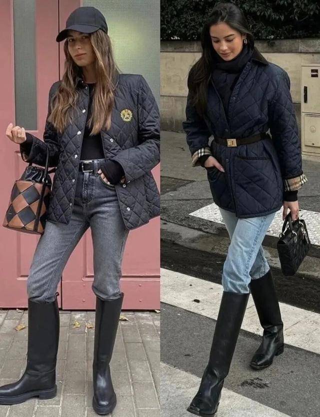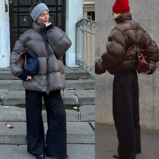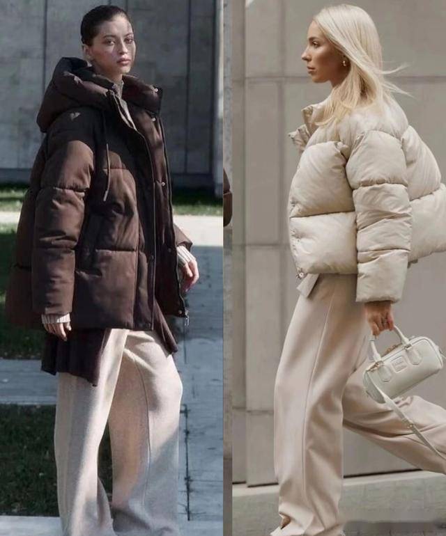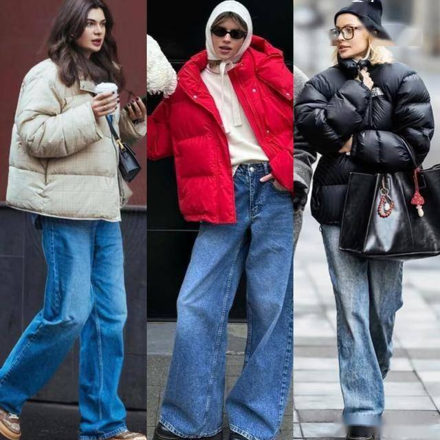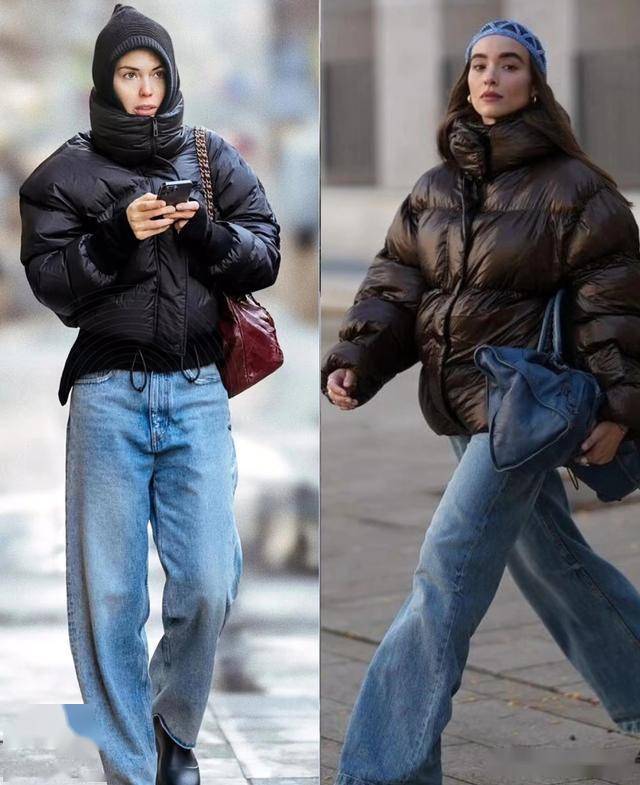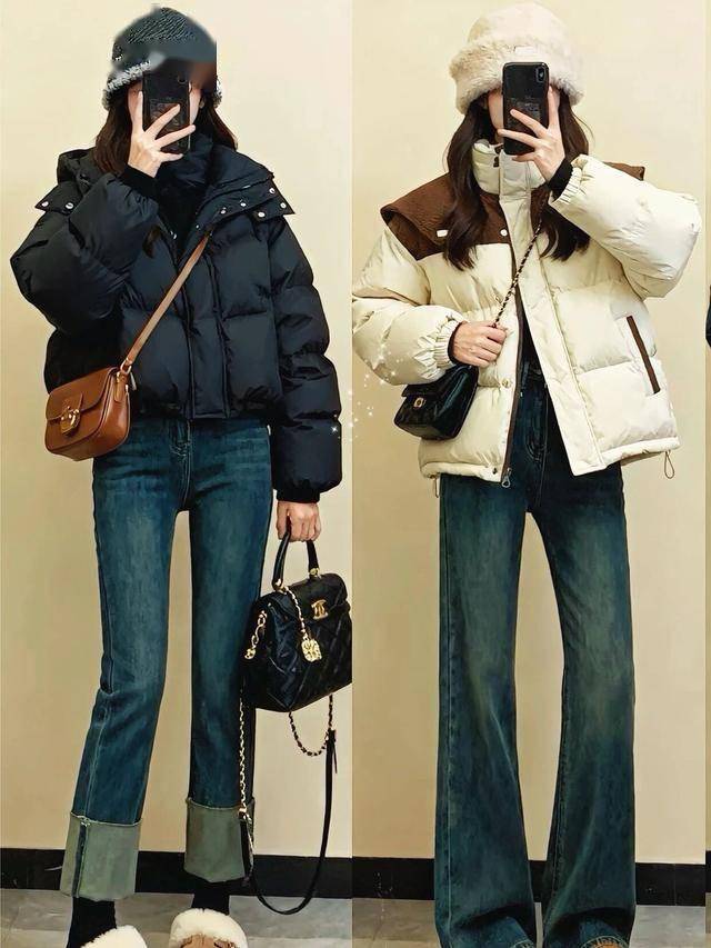 深色短羽绒(如黑色、深灰)配浅蓝色直筒牛仔裤,复古又青春;浅色短羽绒(如燕麦色、白色)配深灰直筒裤,高级又显气质;