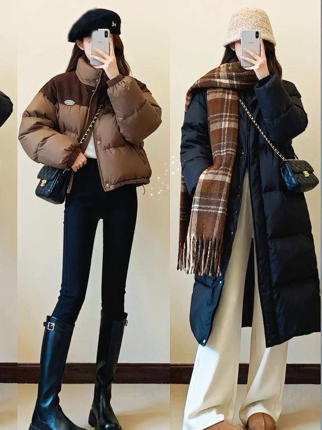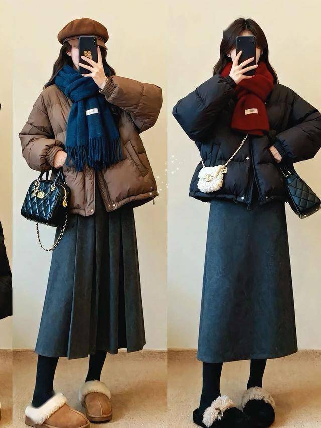 短羽绒+A字长裙:A字版型能遮胯显瘦,长度选“膝盖以下”(比如小腿中部),搭配短靴,既保暖又帅气,适合通勤或约会;