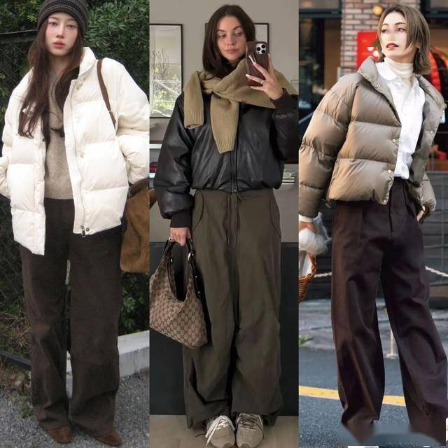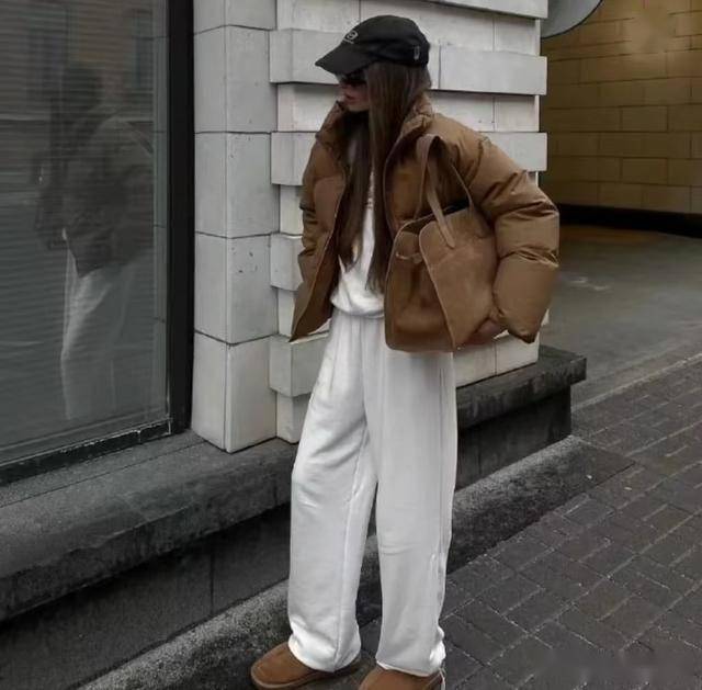 今年冬天蛮流行咖色阔腿裤的,它自带温暖属性,又有种沉稳大气的风格感,搭配米色、白色、黑色等颜色的羽绒服,高级又时髦。