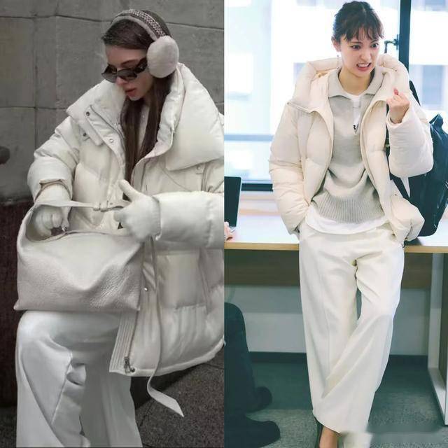 今年蛮喜欢短羽绒搭配白色阔腿裤的,无论哪种颜色的羽绒,只要配上白色阔腿裤,就立马显得清新起来,减龄可爱。