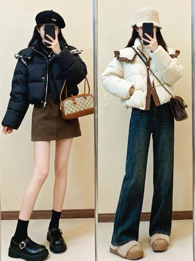 短羽绒选“腰线以上”的长度(比如卡在肚脐附近),搭配九分直筒裤,露出脚踝,再配一双踝靴或小白鞋,瞬间拉长比例;