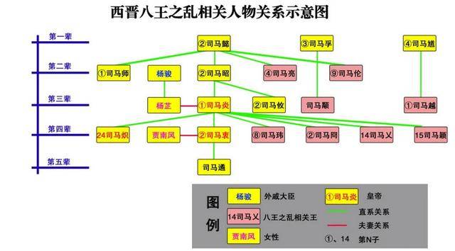 标注杨骏、贾南风、司马亮、司马玮等关键人物,体现外戚与宗室交错的权力网;