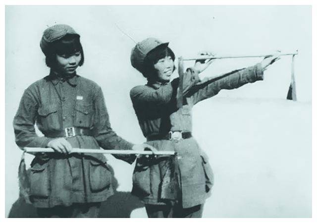 照片中的两位女兵,尽管用腰带系紧了衣服,尽量让自己看起来整洁方便活动,但仔细一看,她们的军装依然很宽大,特别是下摆,已经翘了起来。此外,手中拿的长杆子看起来似乎并不像武器,更像是某种工具。