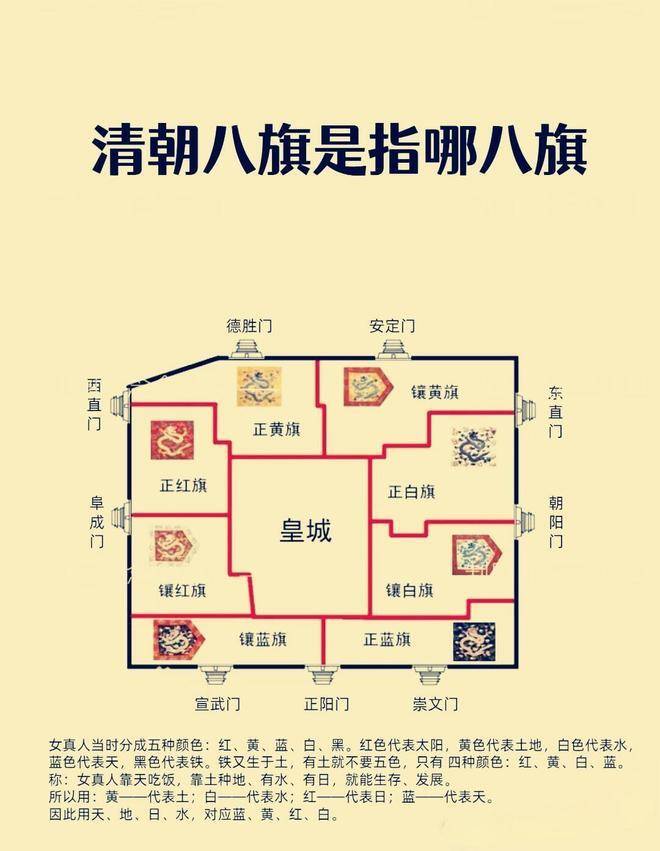其中,正黄旗、镶黄旗、正白旗被称为“上三旗”,由皇帝直接统领;其余的被称为“下五旗”。