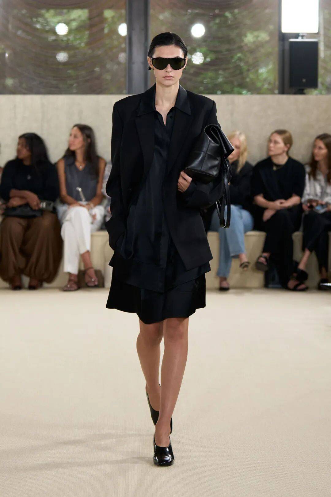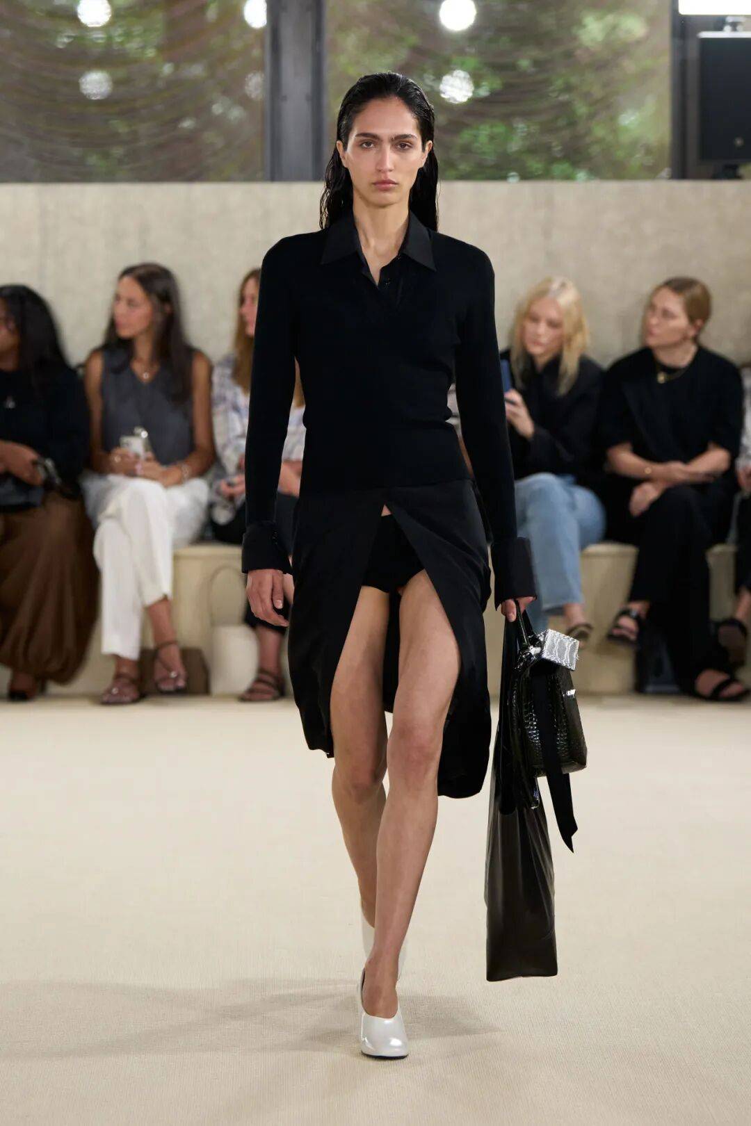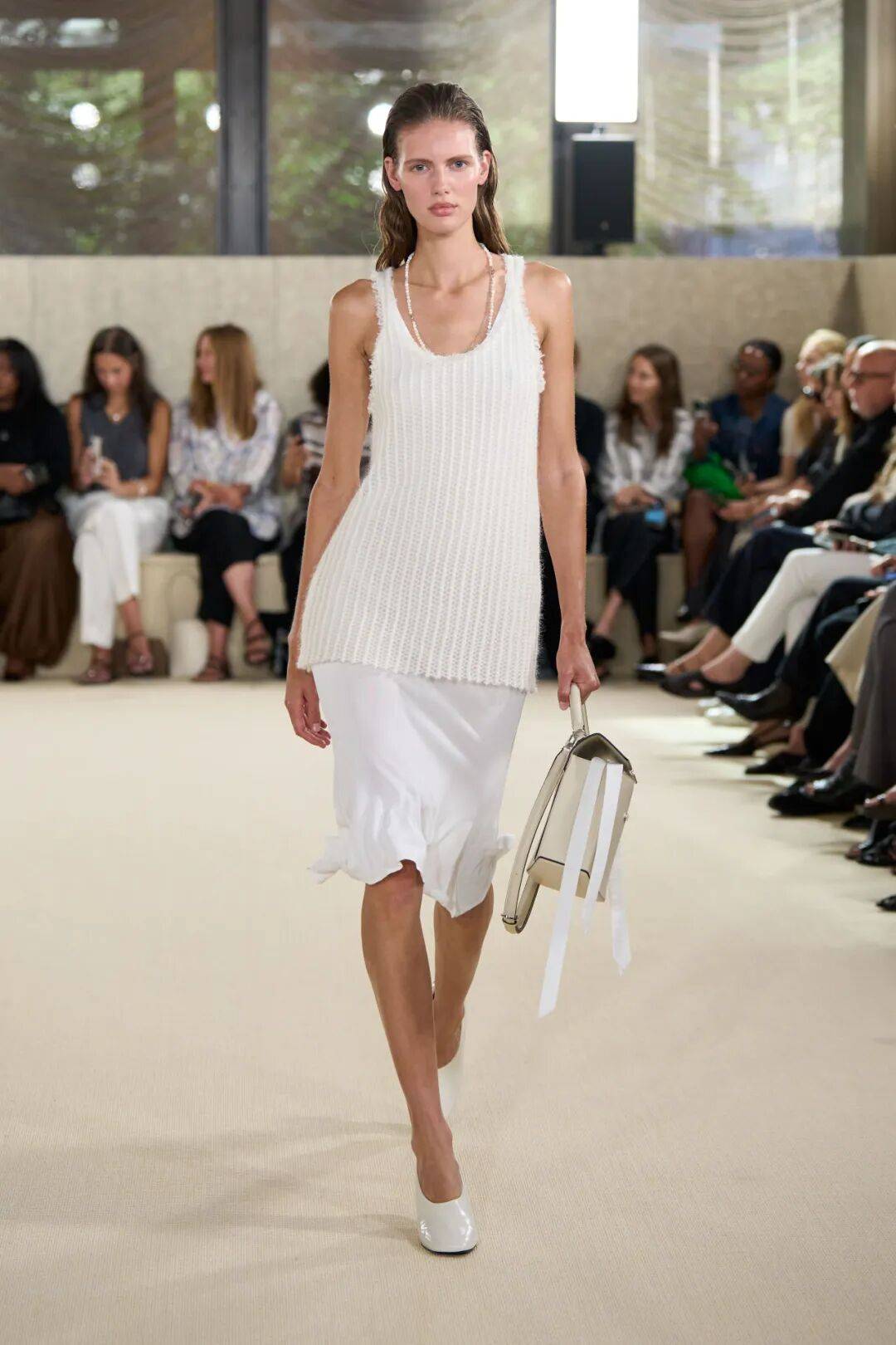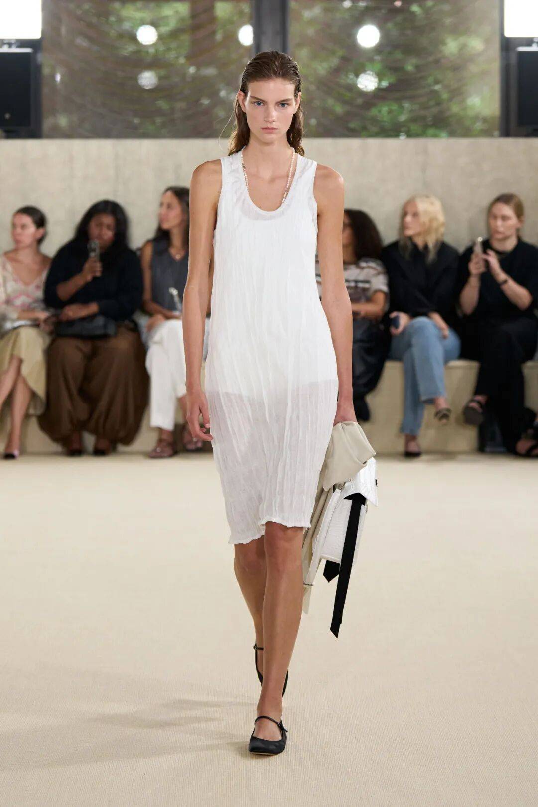 配饰亮点:"方形皮革包袋与贴合足部曲线的高光泽鞋履形成完美平衡,为轻盈的服装增添结构感与步伐节奏。"