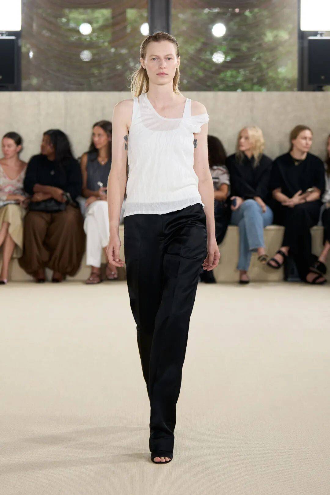 白色的背心吊带上衣,在质感的 差异中增加了一些休闲的层次感,和黑色裤装的搭配,利落也多了一些日常的时尚。