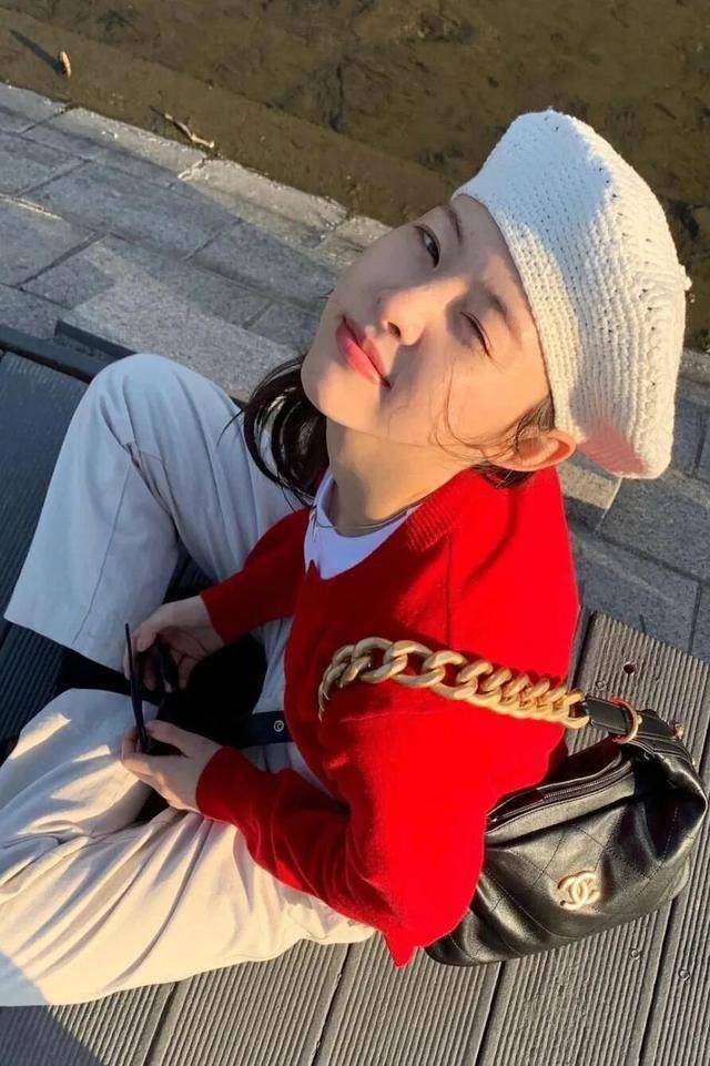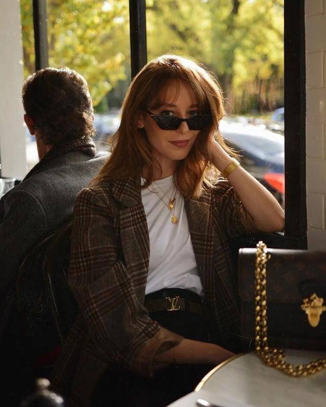 若是觉得金色首饰不够提亮效果,也可以像下图博主这样,用同色系的高饱和度内搭来强调。