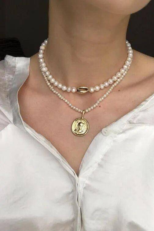 深色服装搭厚重感金币项链,浅色服装配纤巧吊坠