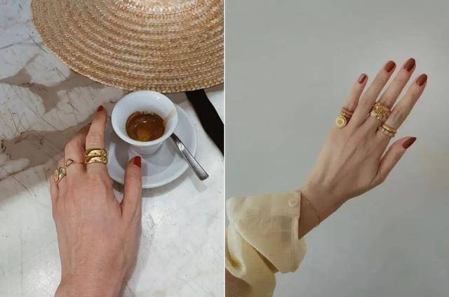 若不想太过高调,小面积的金色戒指也不错,正好跟过年的红色美甲绝搭。