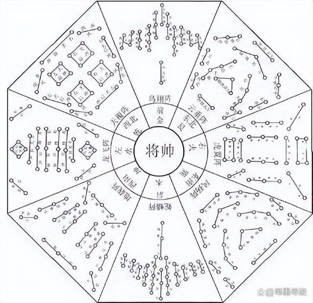 图片5:该图片展示了一个以“将帅”为中心的八阵图,图中包含天覆阵、地载阵、风扬阵、云垂阵、龙飞阵、虎翼阵、鸟翔阵、蛇蟠阵等,各阵由各种线条和符号构成。直观呈现了诸葛亮在军事阵法上的创新成果,是其军事才能的体现。