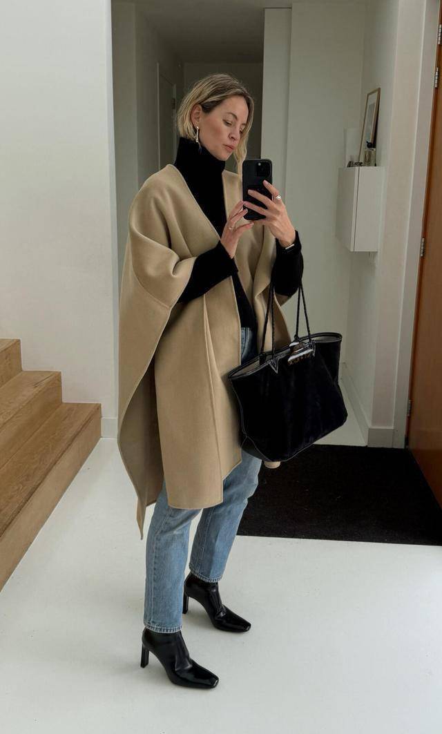 H型黑色大衣:直线剪裁利落显瘦,搭配牛仔裤平衡正式感。