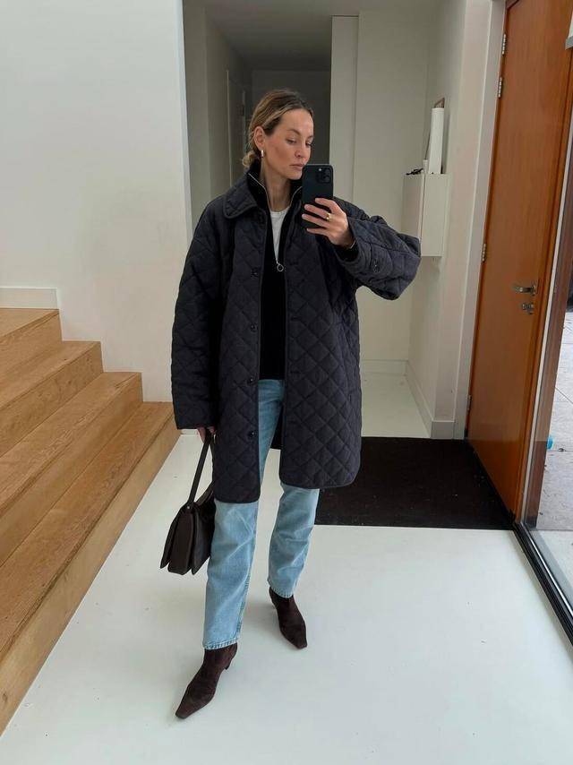 直筒牛仔裤:青春感中和厚重外套,蓝黑配色经典不出错。