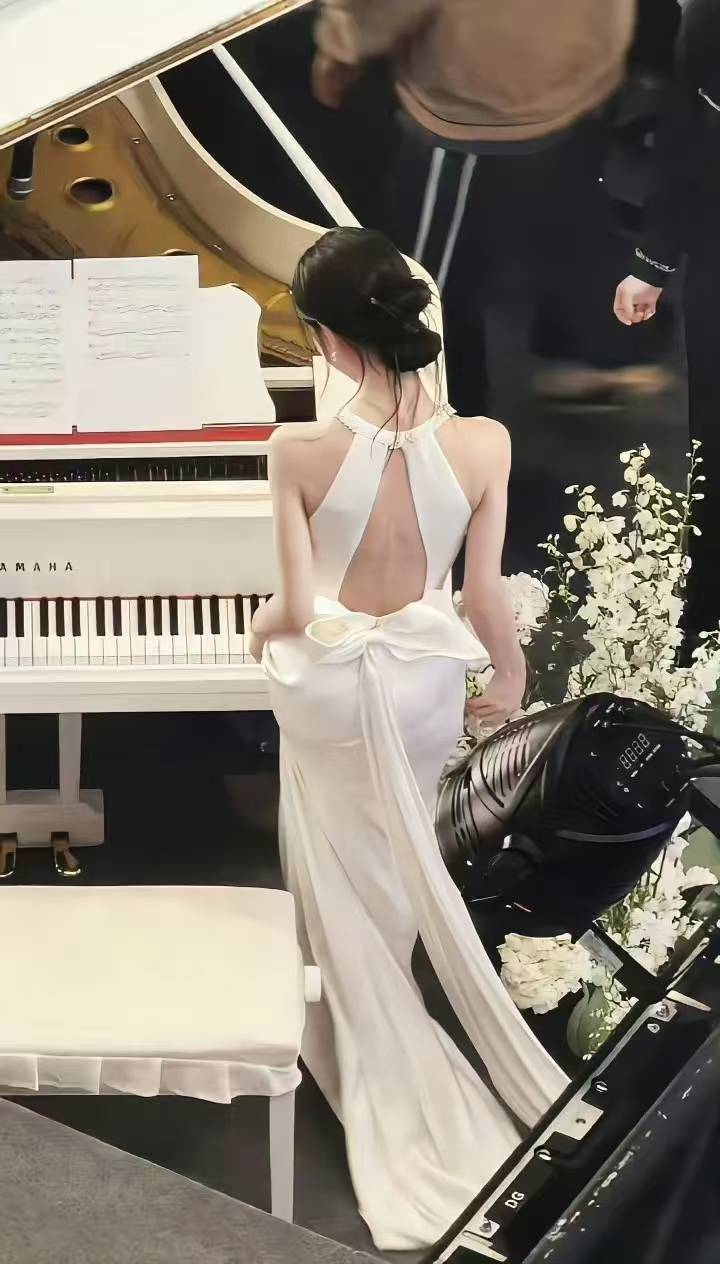 场景:活动现场,裙摆随步伐摇曳,背景虚化突出人物。