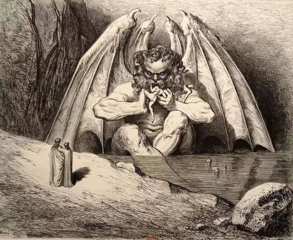 他的这次堕落,在文学中被放大到了极致。在地狱最深处——科奇土斯冰湖里,他被彻底冻在绝望之中,三个巨大的头颅不停地咀嚼着叛徒,每一个动作都透露出无力与悲凉。