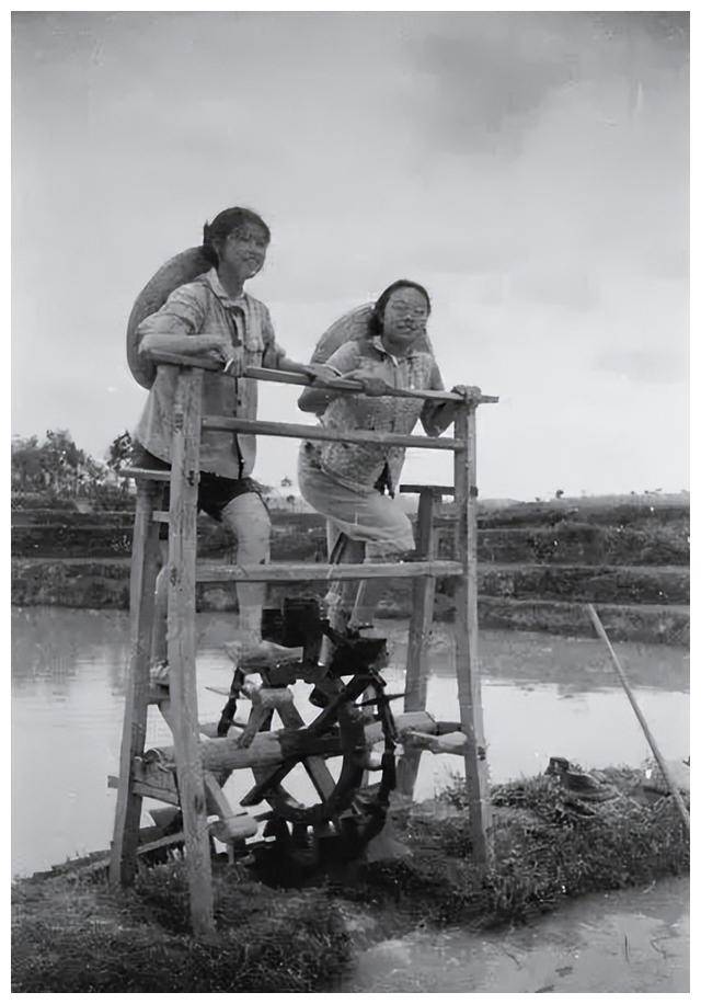 两位女同学踩着水车,动作轻盈,仿佛在享受这份劳作带来的乐趣。