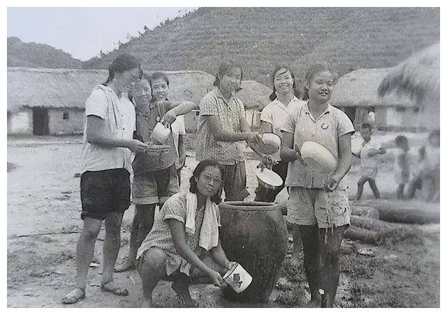 女知青们正在水缸旁舀水洗手,尽管环境简朴,但她们的表情依旧充满朝气。