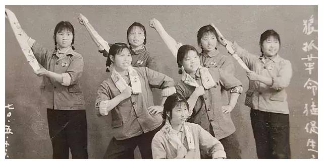 照片上,女知青们设计了一个造型,标语写着狠抓革命,猛促生产,她们用这样的方式表达对时代的热情与投入。