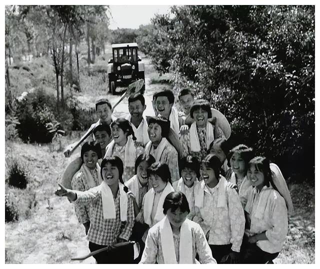 男女知青站在拖拉机上,气氛轻松愉快,大家或是唱歌,或是笑着,脸上洋溢着青春的活力。