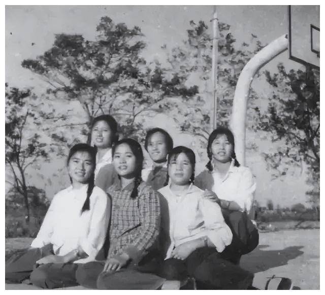 这些女同学们在篮球架下拍下了合影,大家穿着简单而整齐,彰显着那份朴素的美。