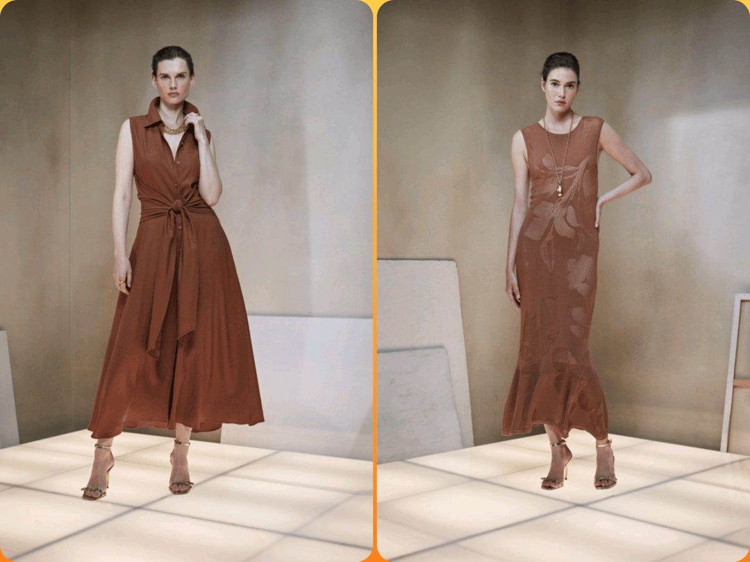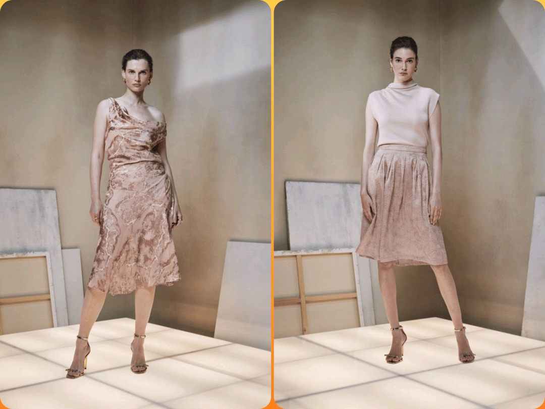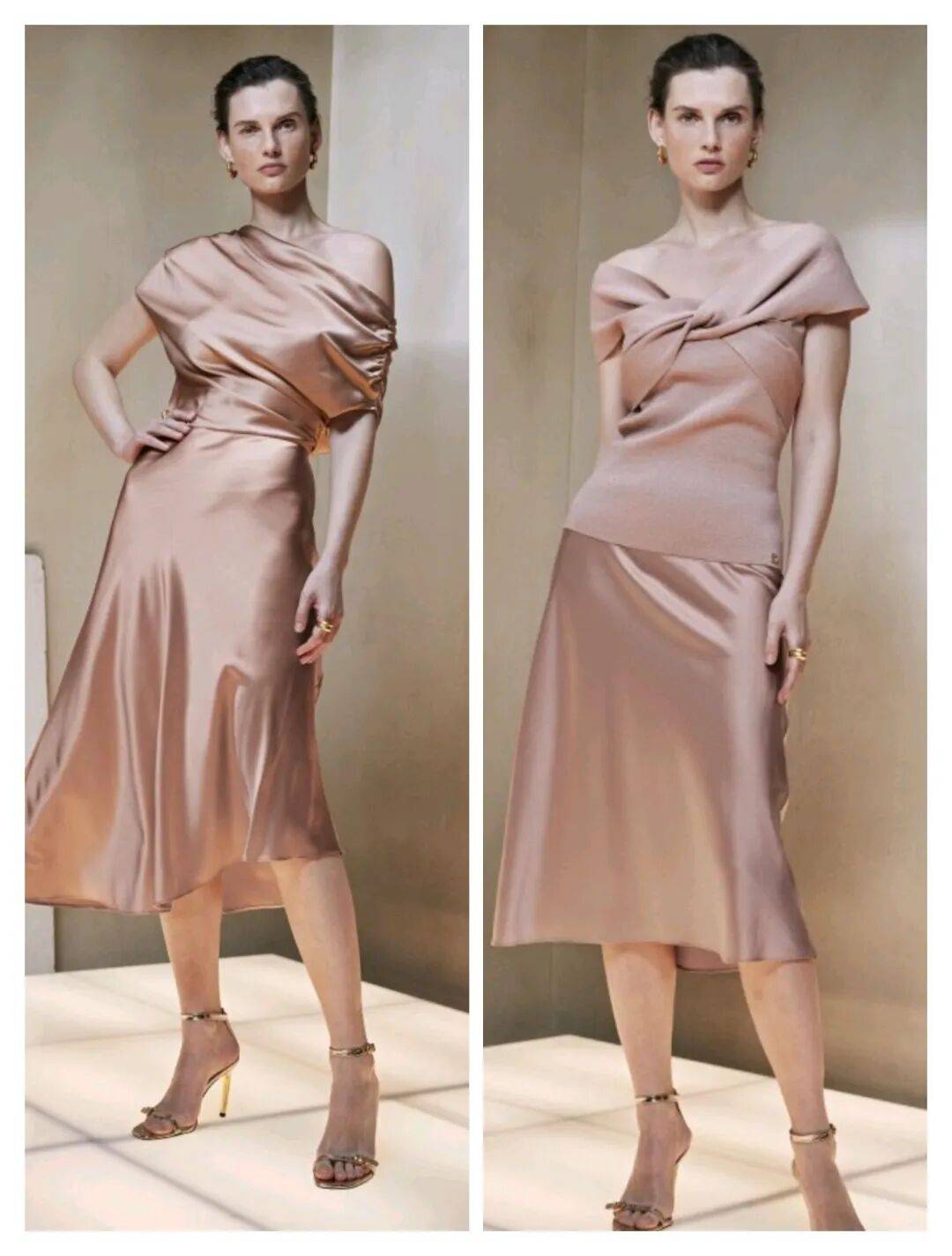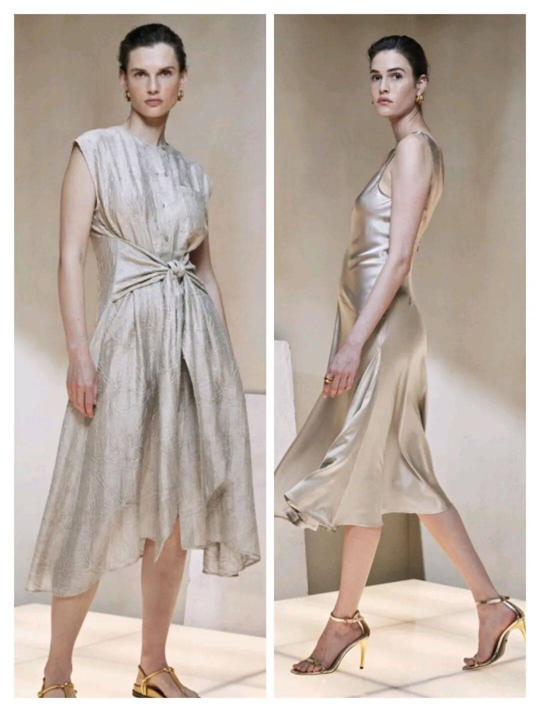 裙装成为系列精髓:堆叠褶皱赋予静态面料动态呼吸感,不规则下摆打破刻板优雅,不对称肩带设计在随性中透露出精准把控,展现“柔而不弱”的内在力量。