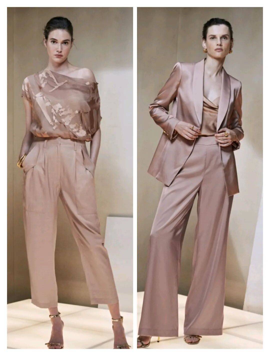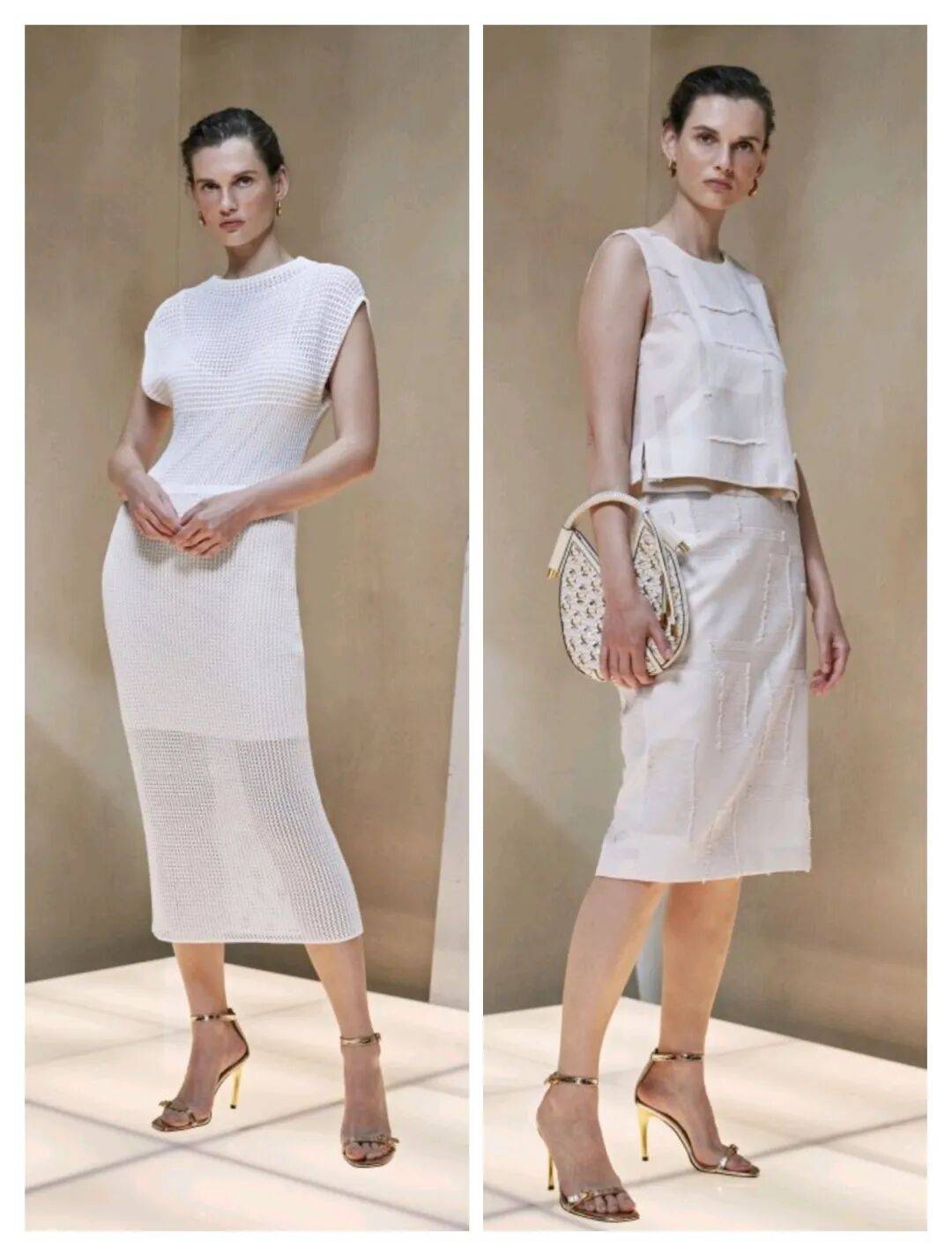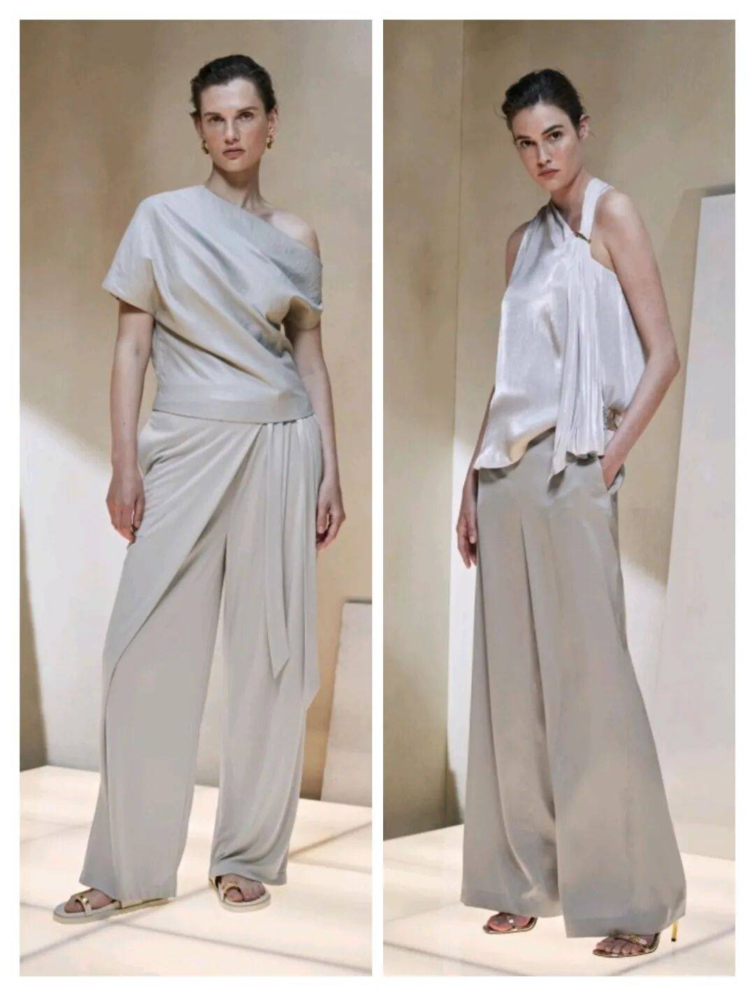 从光泽感连衣裙到纹理感上衣+直筒裤套装,系列单品可自由组合于职场、社交、休闲场景,呼应都市女性多元角色切换的需求。珍珠白针织衫通过系带设计实现昼夜造型转换,体现“一衣多面”的智慧。