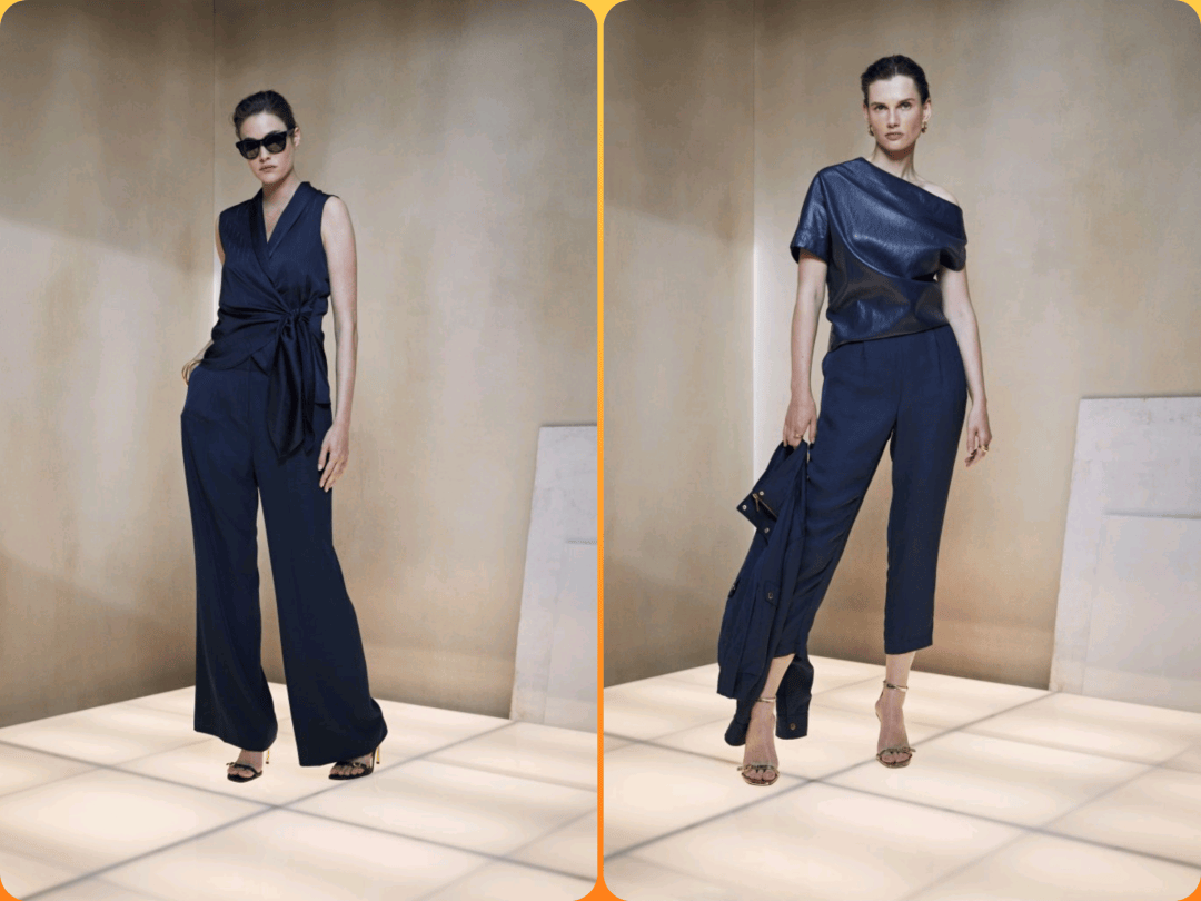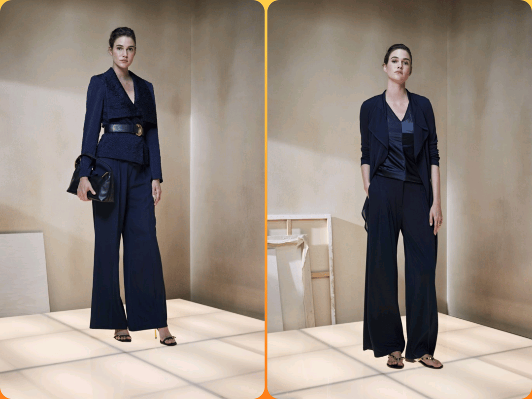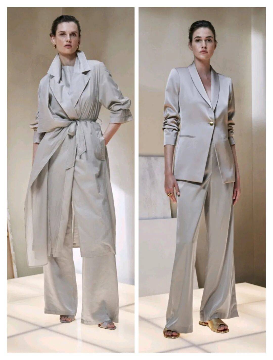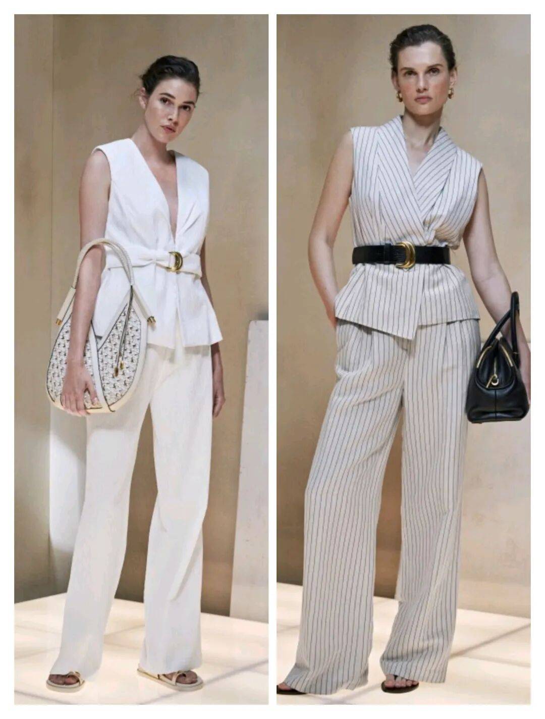 利落直筒裤、结构性夹克保留职场干练基因,但通过落肩设计、宽松廓形弱化僵硬线条;西装马甲套装以腰带收束腰线,在强势廓形中注入曲线柔美,塑造“柔韧”的形体语言。