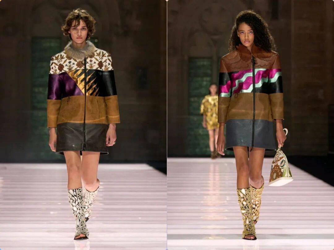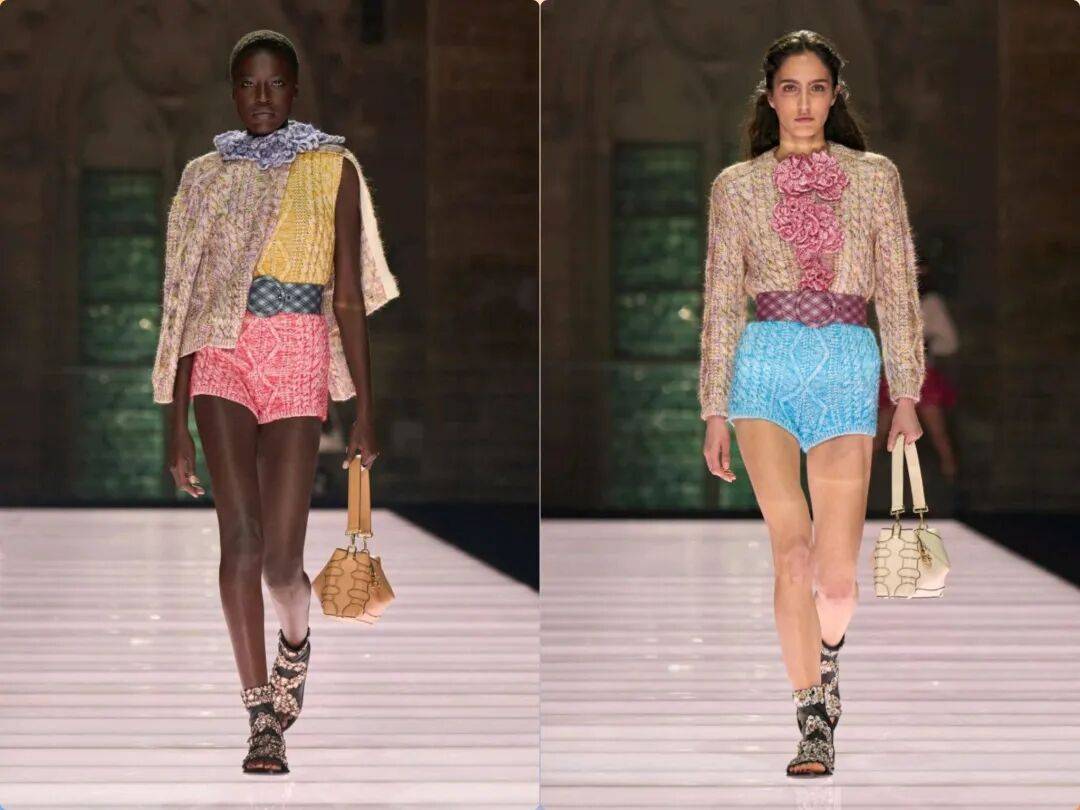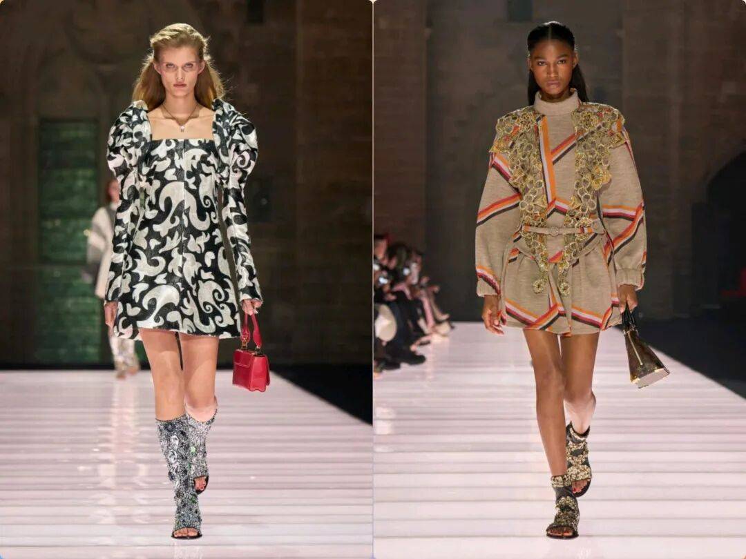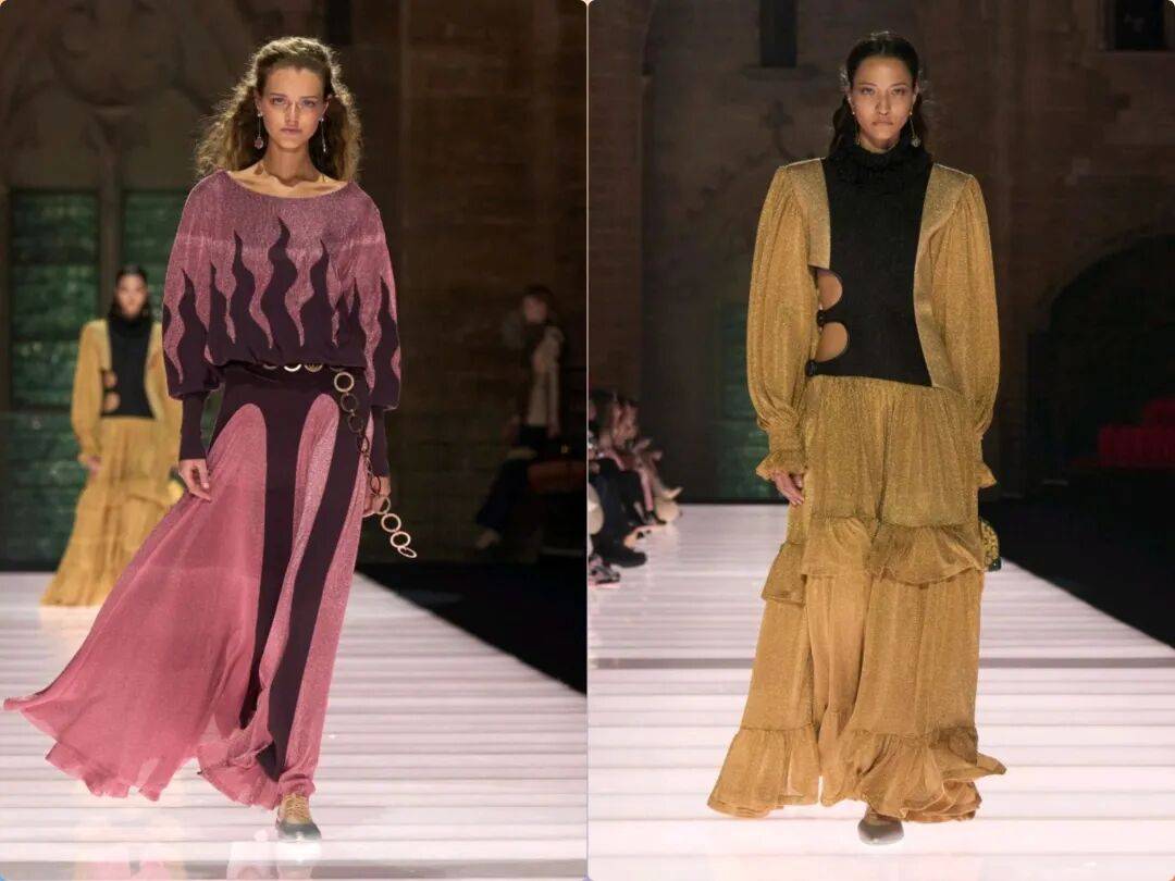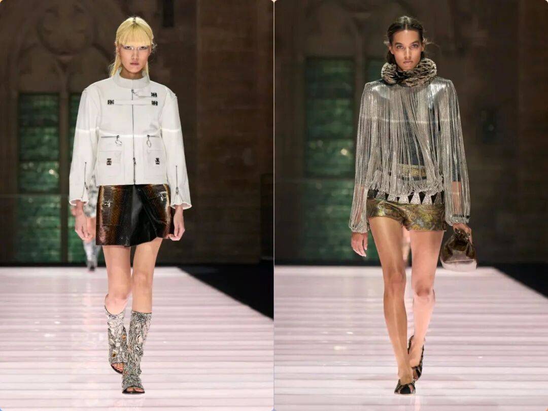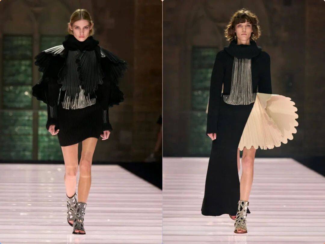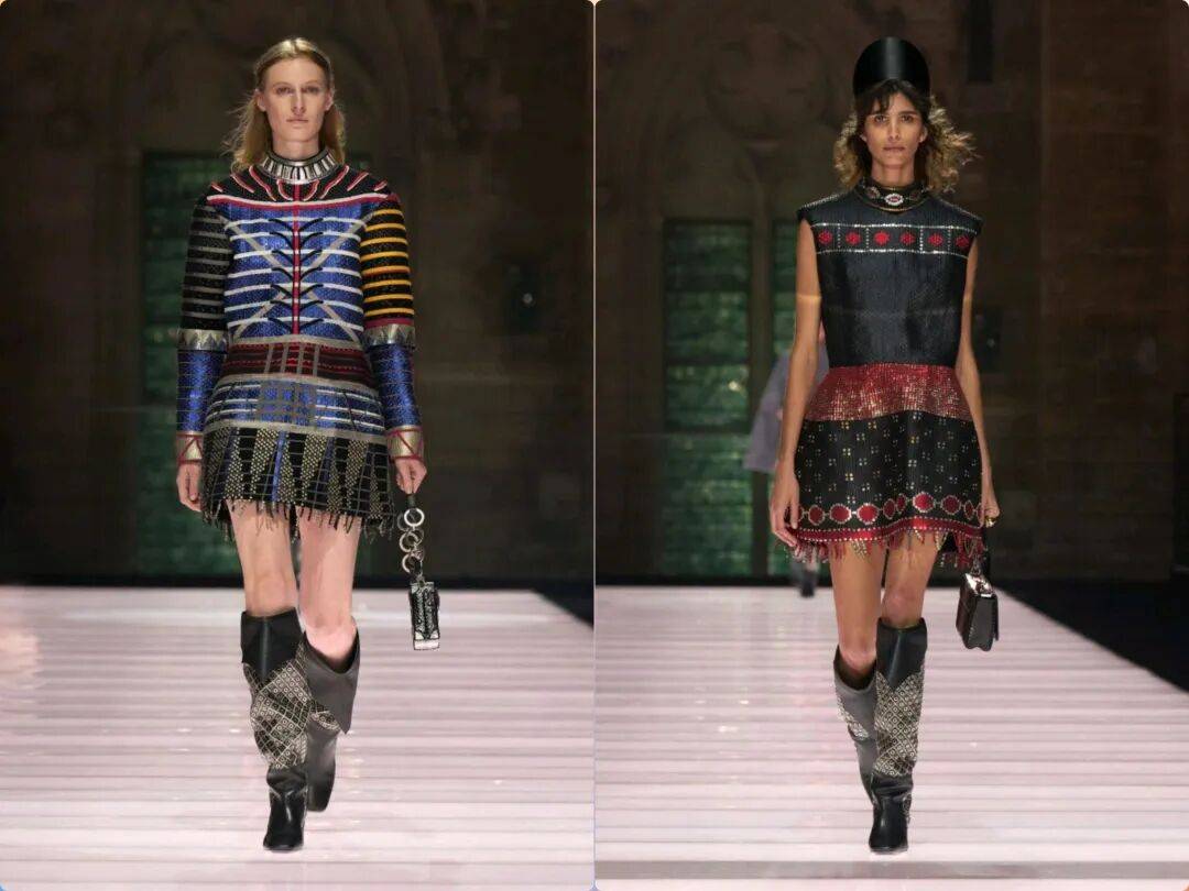 斗篷披肩与镂空肌理:大量运用不对称斗篷、流苏披肩,结合镂空花纹与高腰剪裁,呼应游牧民族的自由精神,同时通过金属腰饰、立体珠绣注入未来科技感。