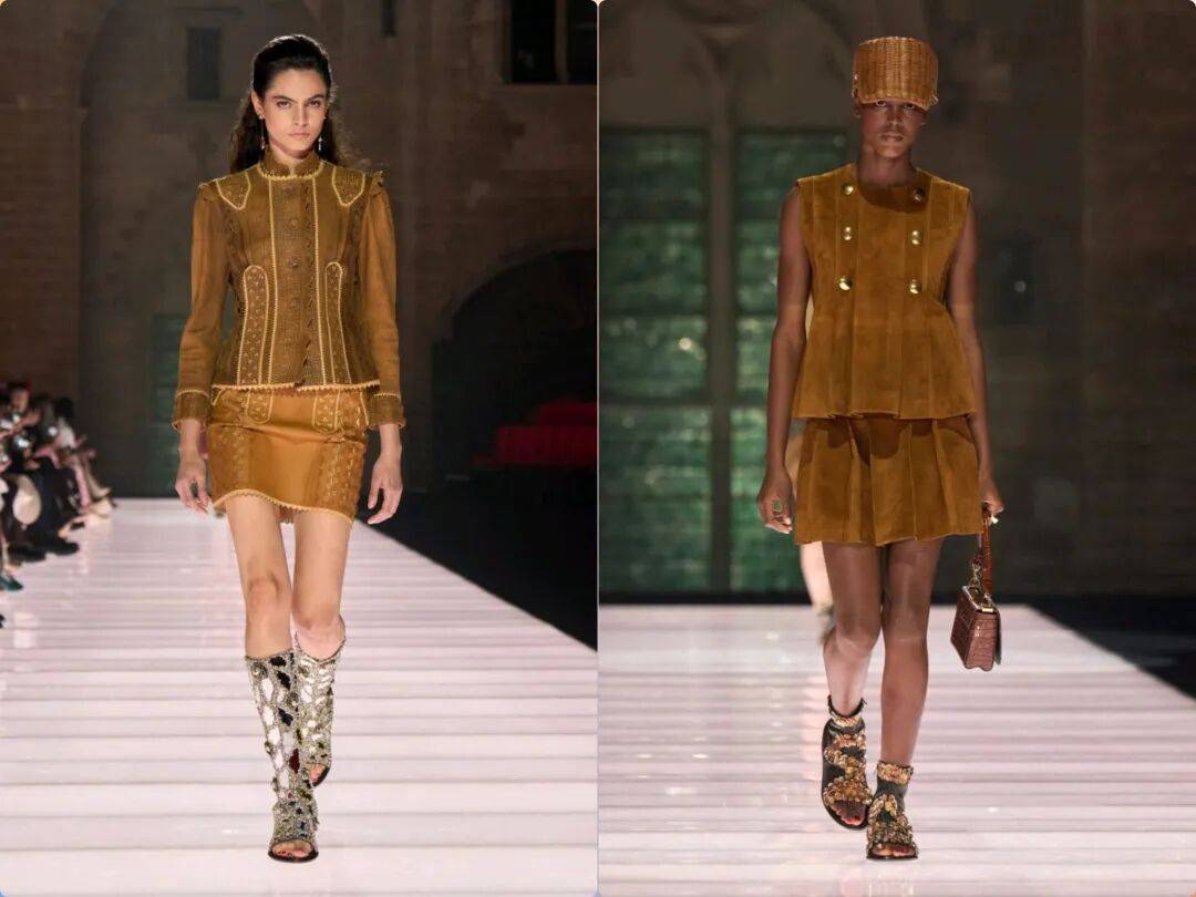 棕色系的颜色在服装之上,以不同的棕色颜色进行对比搭配,在色彩冲击中也增加了一些花纹图案的活力,这些图案以一些光滑的材质增加更多质感。
