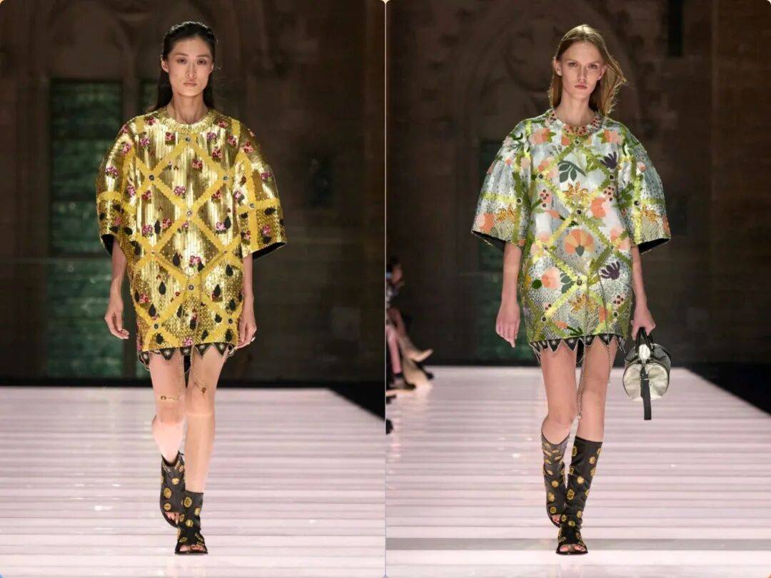 宽松廓形的短袖裙装在廓形的线条中,还有袖子多了一些夸张的设计感,为裙装增加了一些时髦气质,以光泽的质感多一些华贵,还在线条格纹和花纹图案的结合搭配,多了混搭的时尚。