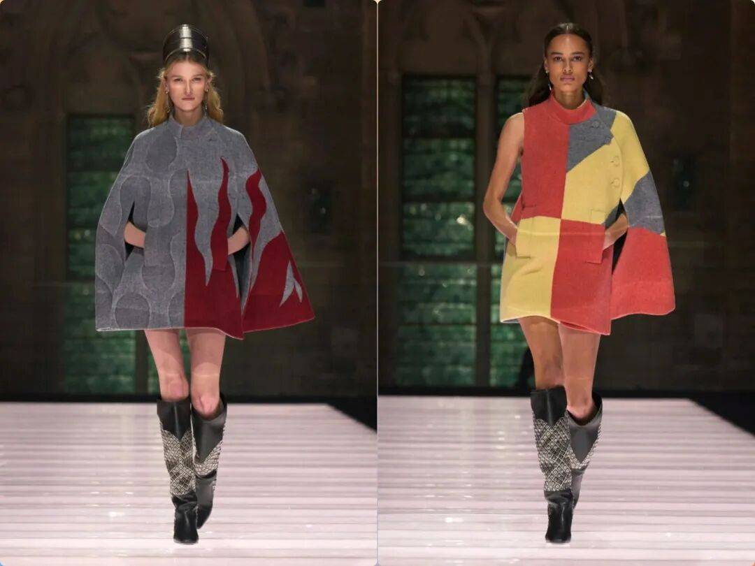 斗篷元素的袖子在A字线条的张力中,结合了开叉等设计,增加了廓形和线条的时尚感,还在服装之上,以高领等设计,多了几分对脖颈线条的修饰,也在灰色和一些红色、黄色等颜色的对比中,增加了图案的装饰时尚。