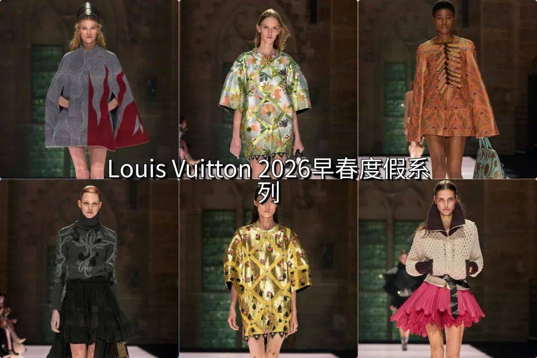 Louis Vuitton 2026早春度假系列,这些服装之上,随处可见的是一些斗篷披肩元素、设计感造型的袖子、拼接设计、活力的艺术感花纹、不规则的线条、不对称设计等,在这些多种设计的结合搭配中,以细节增加了一些奢华永恒的细节,打造未来主义的时髦设计感。