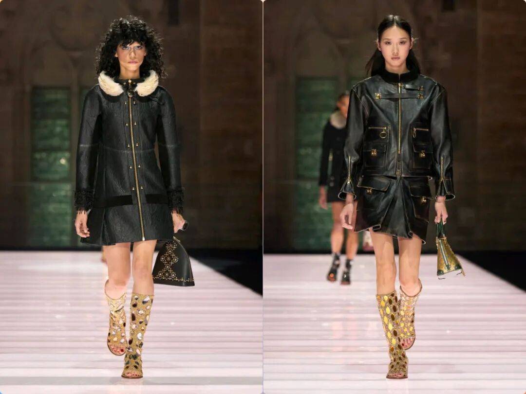 光滑绸缎与毛绒领口碰撞,硬朗皮革与薄纱层叠,营造虚实交织的质感。