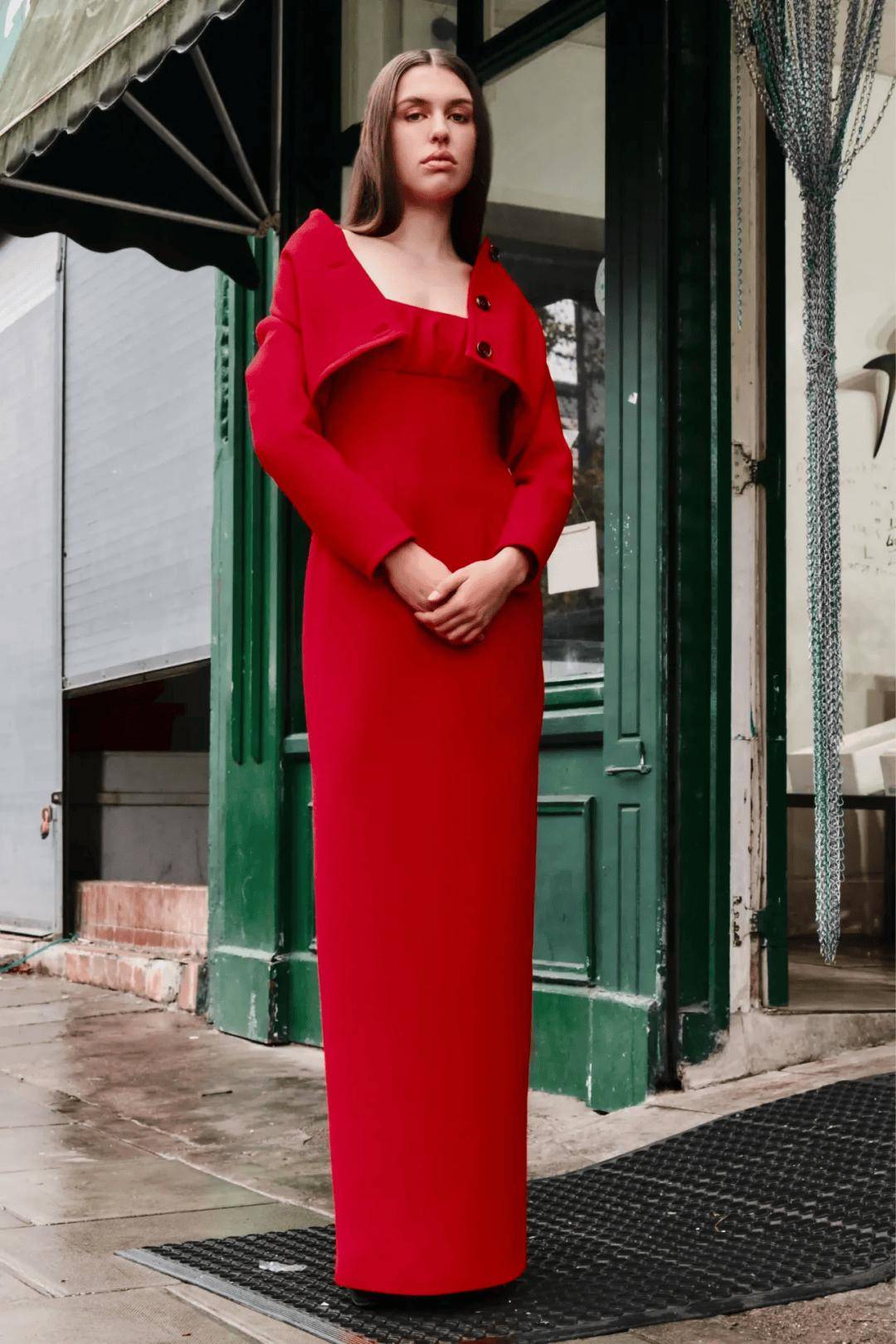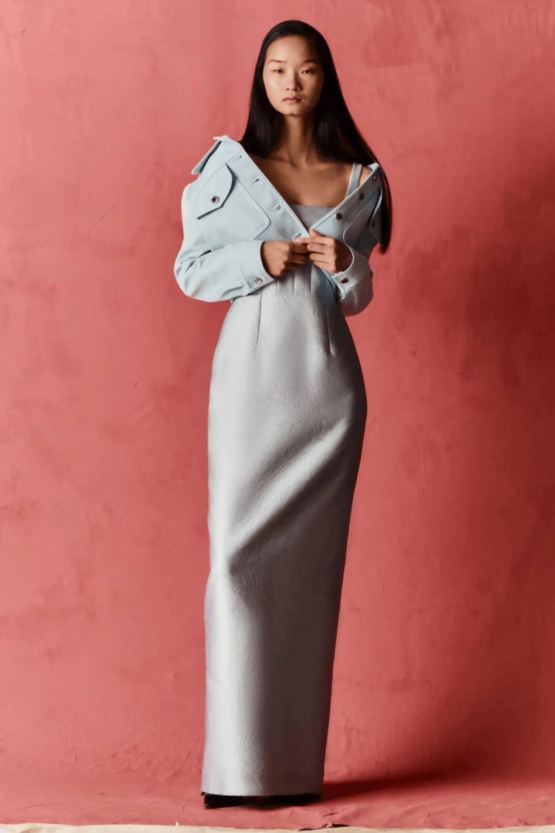 配饰可能包括同色系缎面高跟鞋、结构化手包,强化整体协调性。