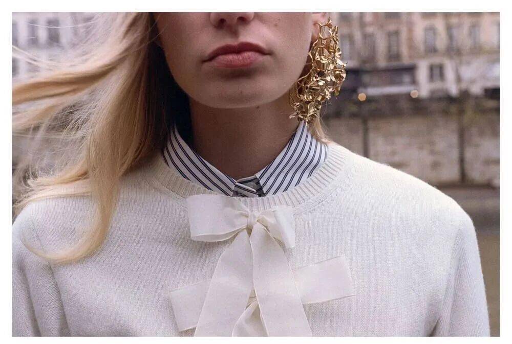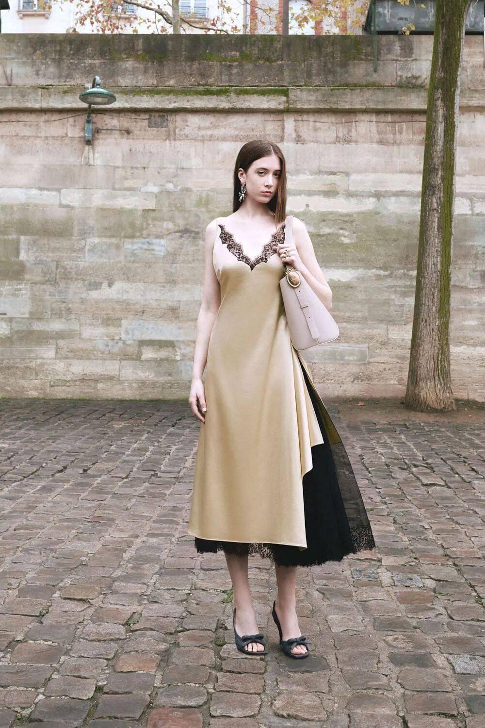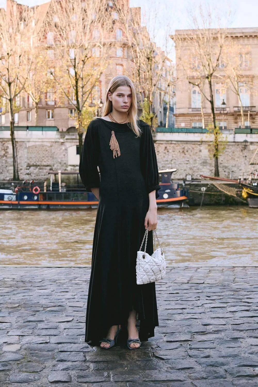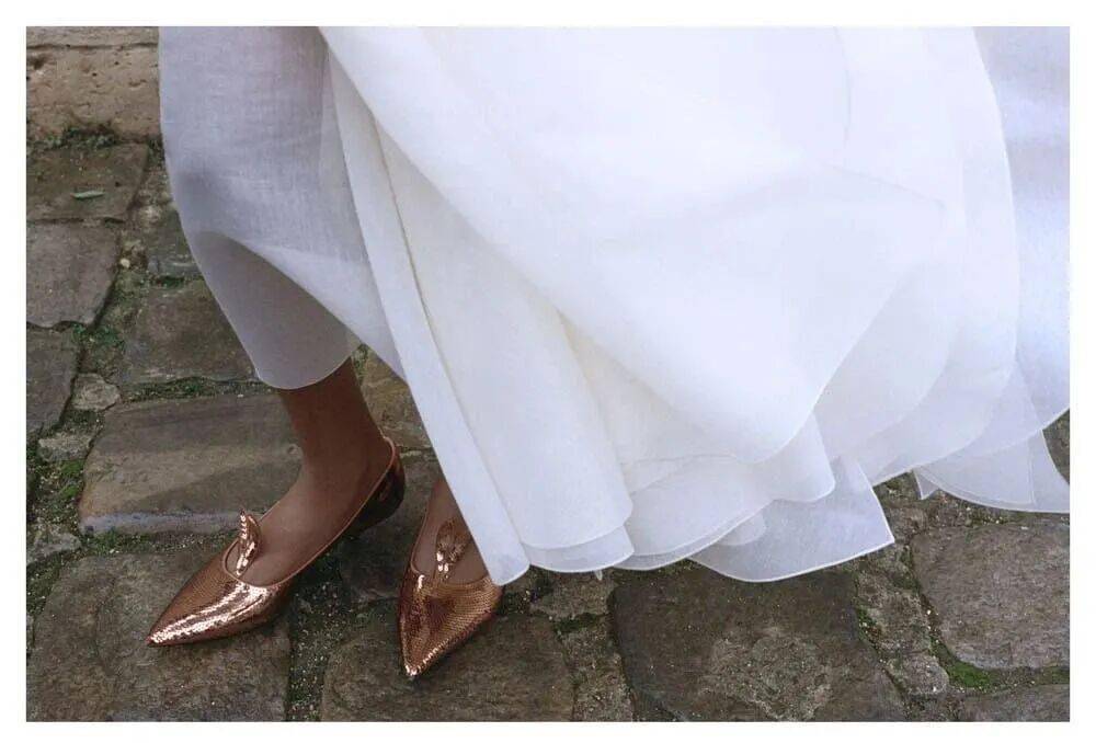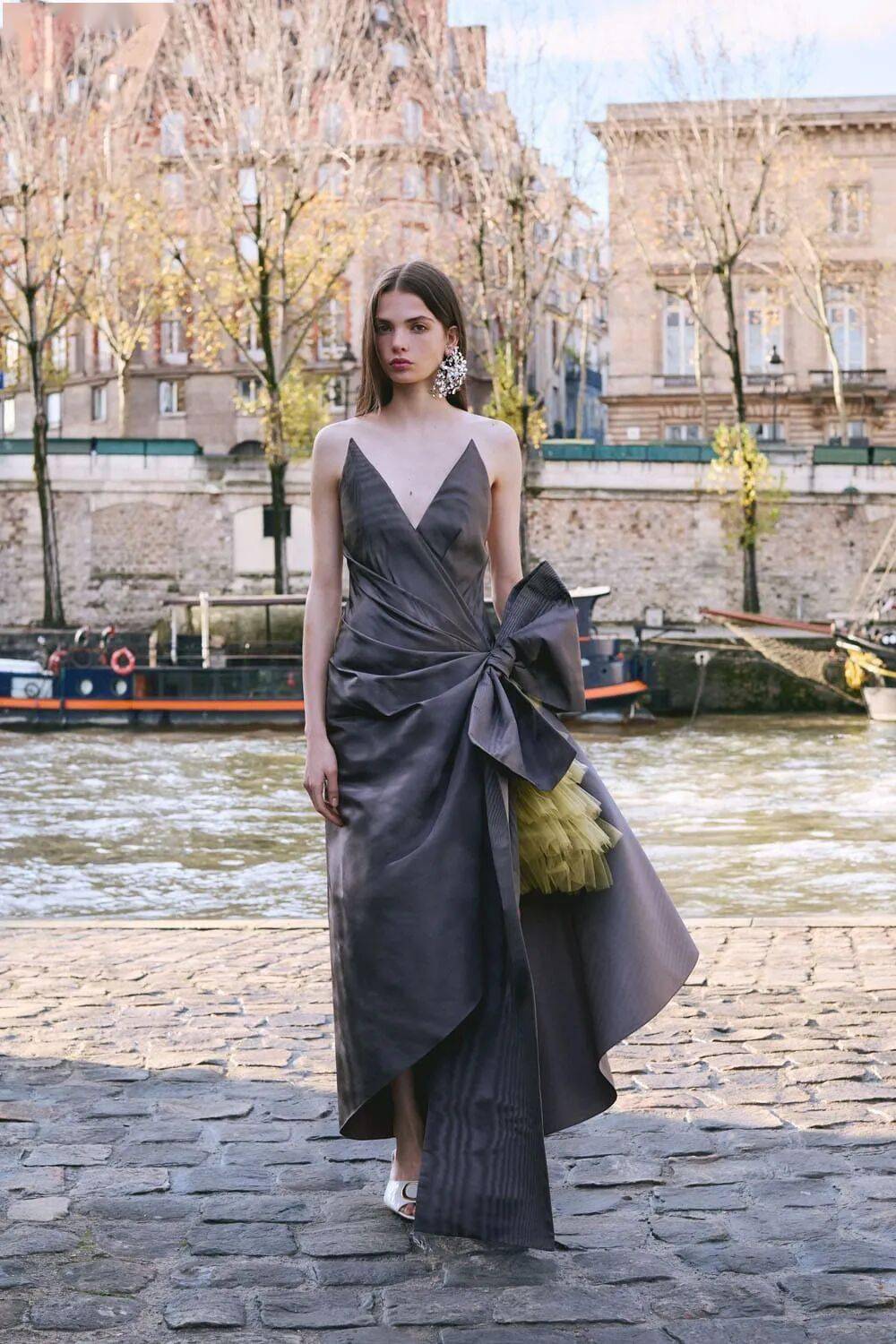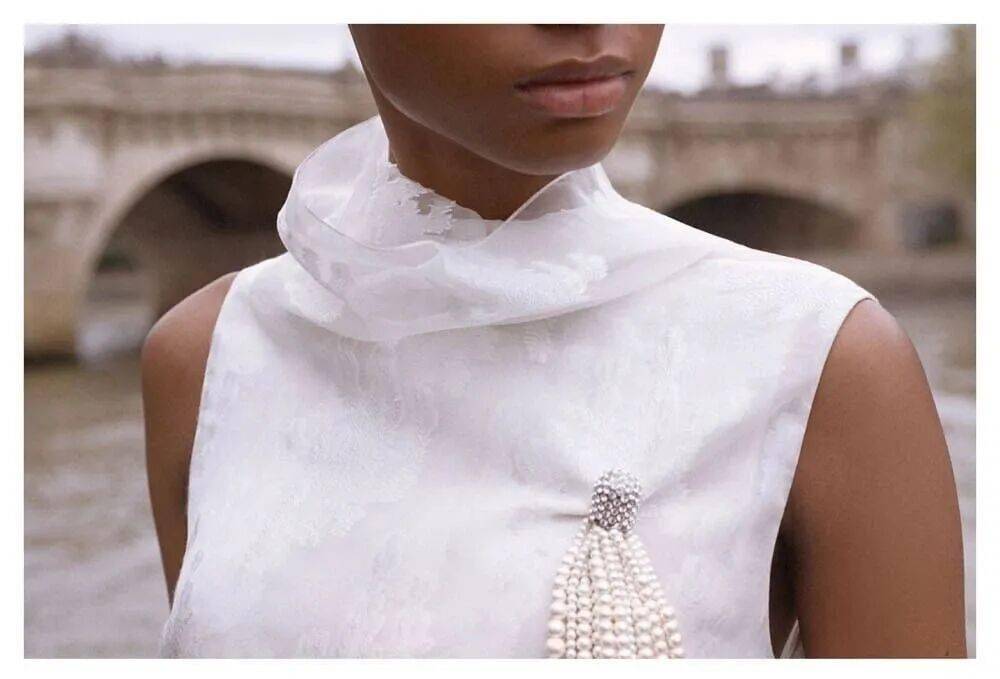 鞋履与珠宝:芭蕾舞鞋搭配蕾丝面罩,致敬意大利舞会风情;短项链与装饰性蝴蝶结优雅点缀颈部,强化巴洛克式华丽。