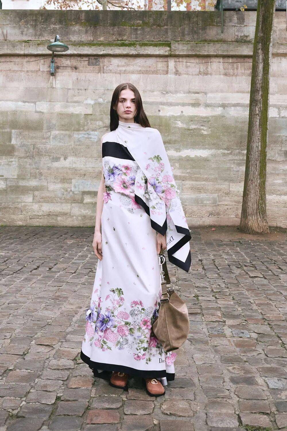 文化符号融合:洛可可艺术元素(玫瑰刺绣、Diorette吊饰)与英伦格调(多尼戈尔粗花呢、军团领带)交织,致敬迪奥先生对欧洲文化的挚爱。