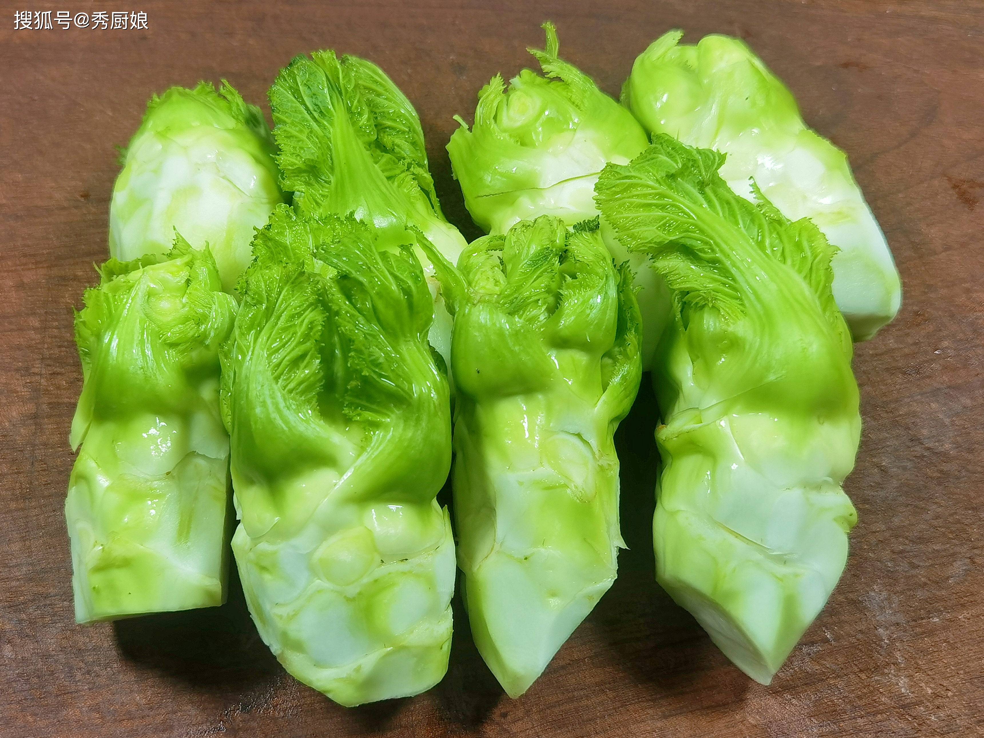 去皮后切成菱形片或半圆片(好看易熟),厚度与儿菜片相近。