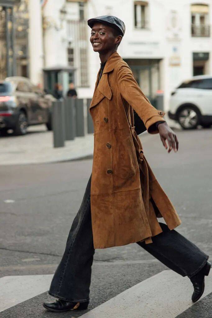 棕色的大衣在色彩的低调中,磨砂材质增加了材质的纹理质感,以宽松裤装搭配,休闲和利落。