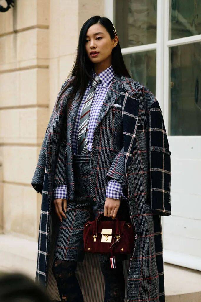 格纹的大衣在色彩的对比中,撞色也多了格纹图案的经典复古气质,在宽松廓形的休闲舒适中,搭配了针织和格纹元素的内搭,为这些穿搭增加了一些层次和细节的亮点。